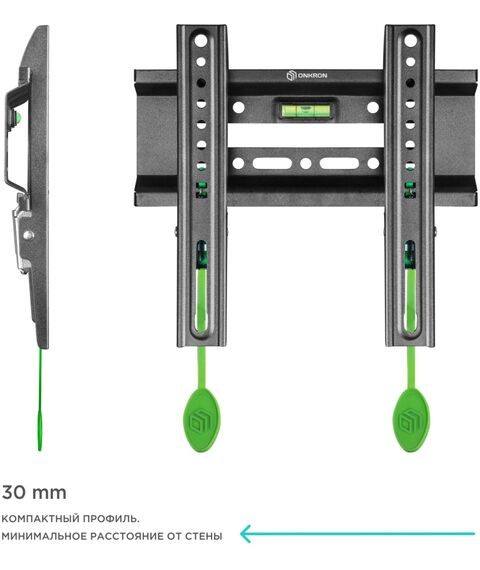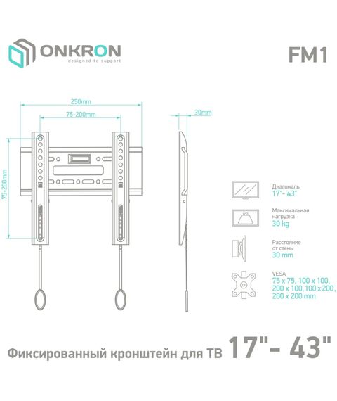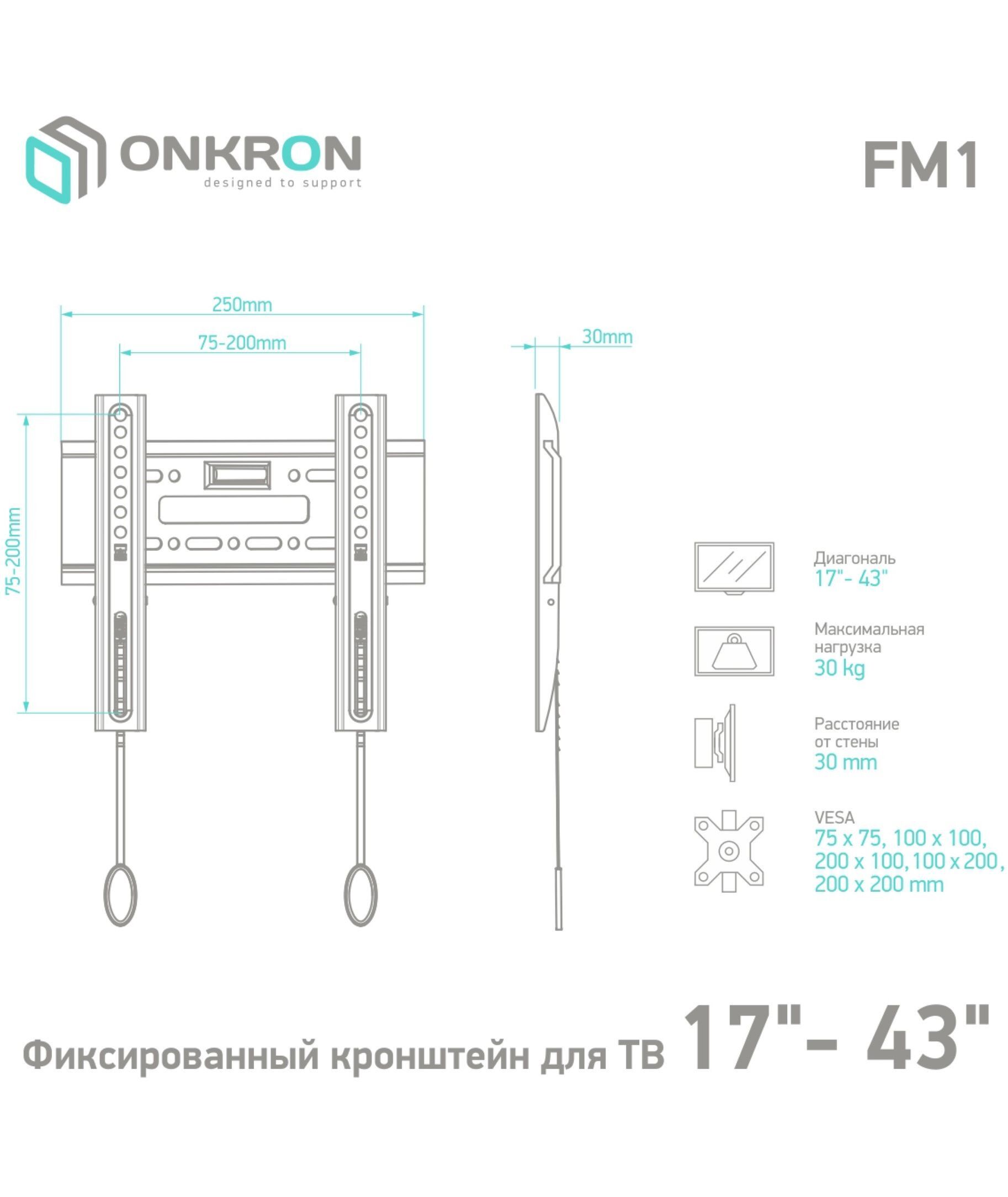 Настенный кронштейн ONKRON FM1 предназначен для телевизоров с диагональю от 17 до 43 дюймов . Максимальный выдерживаемый вес составляет 30 кг.
