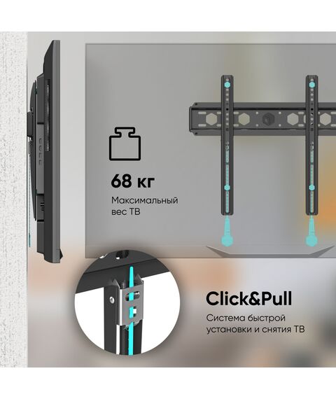 | Особенности | Встроенный уровень. Простая система фиксации Вашего телевизора. Декоративные накладки. Тонкий профиль. |
