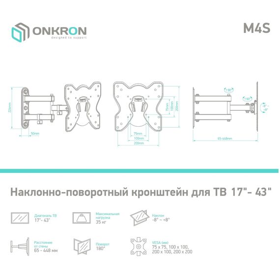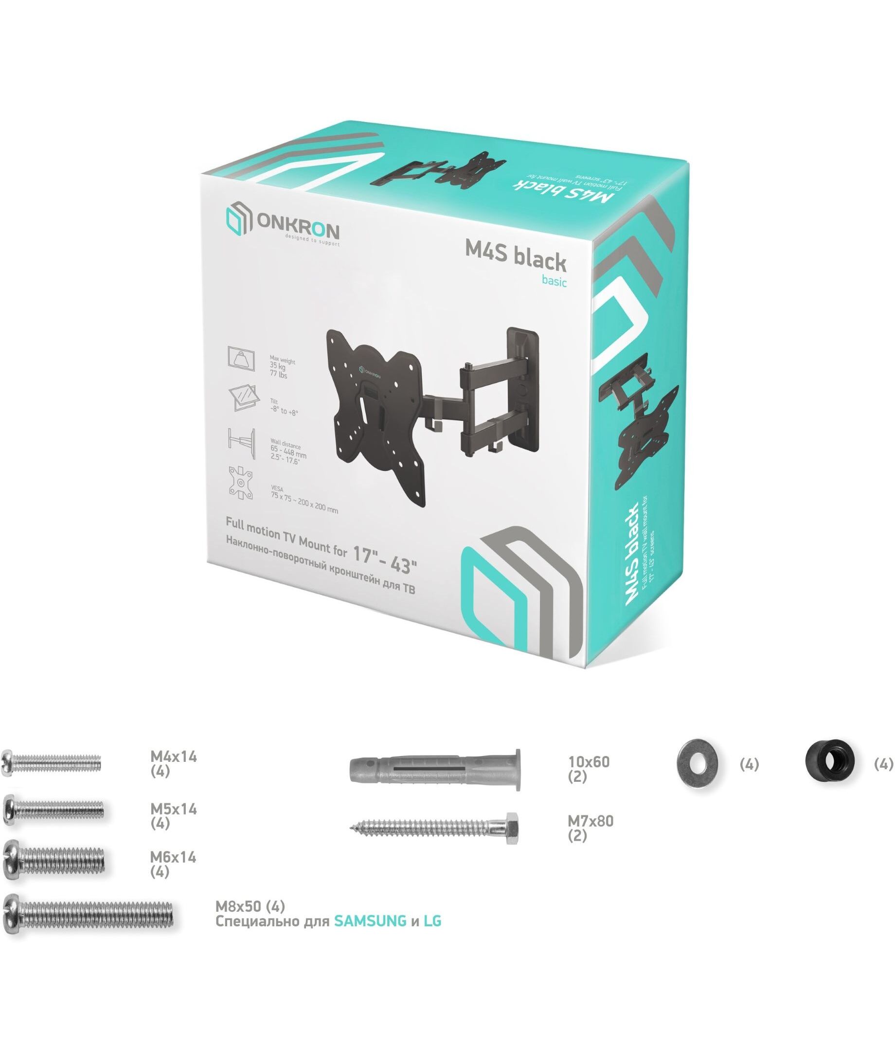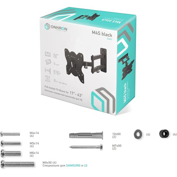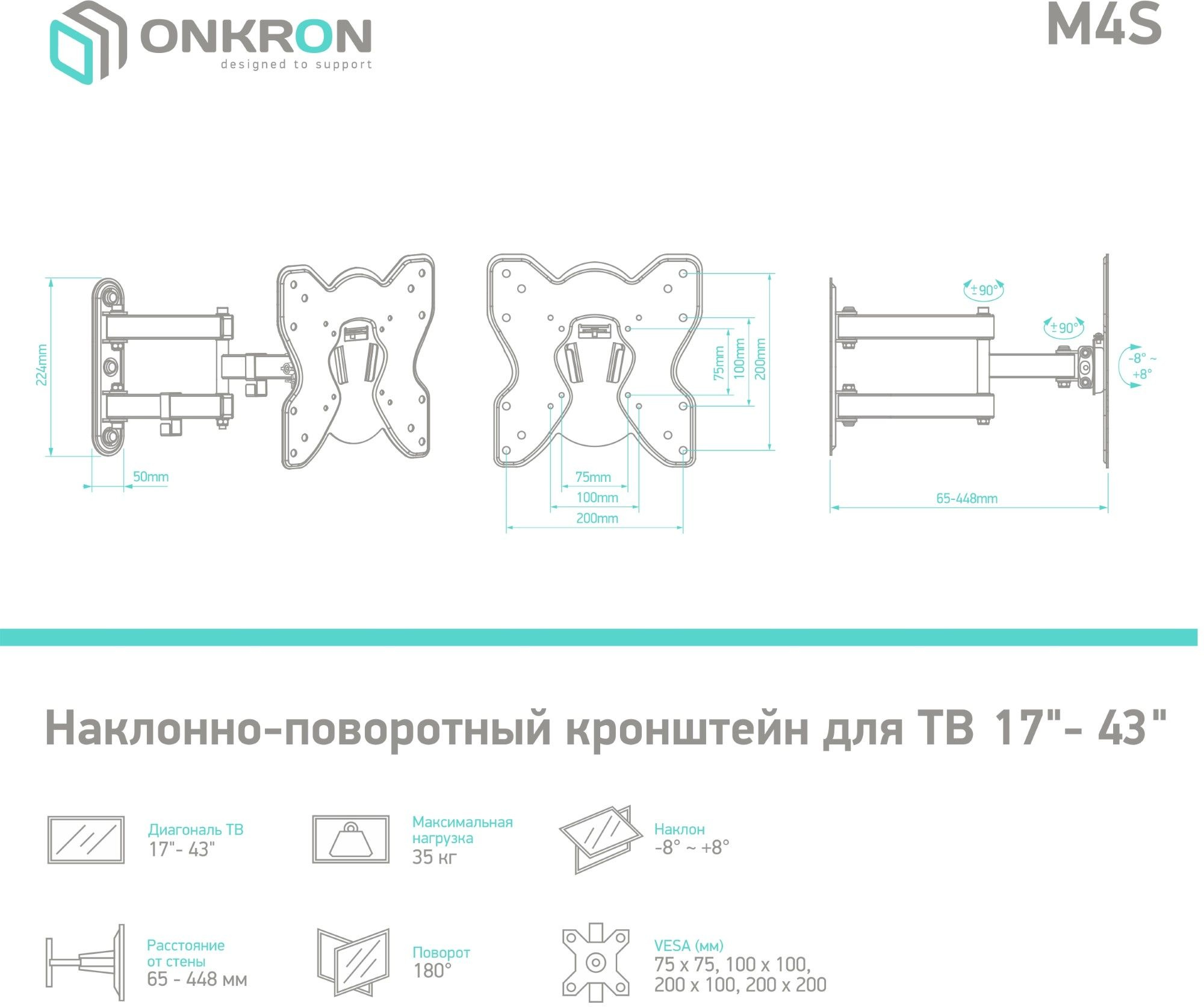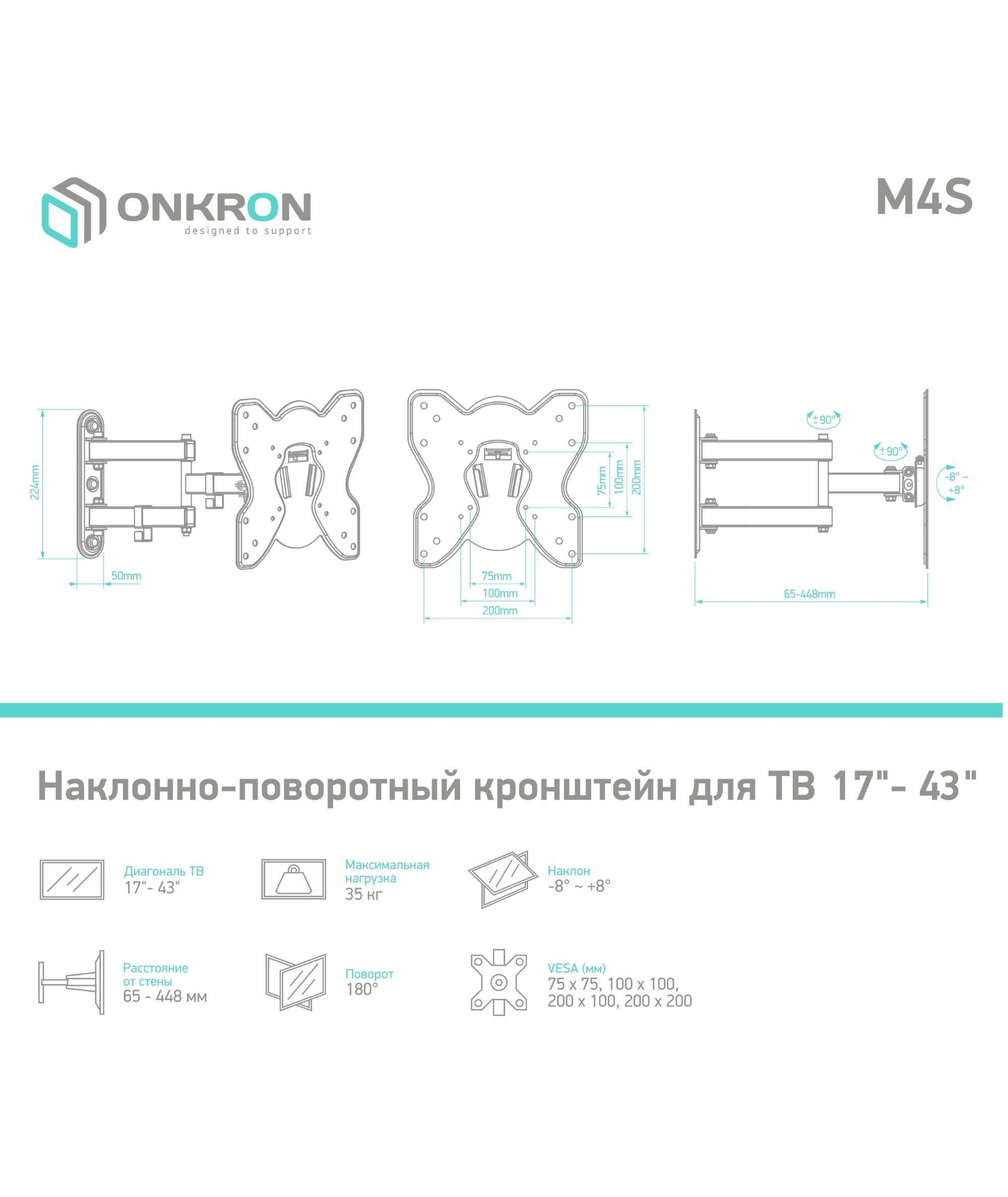 Настенный наклонно-поворотный кронштейн ONKRON M4S предназначен для ТВ с диагональю от 17 до 43 дюймов. Он подходит для небольших телевизоров и мониторов весом до 35 кг.