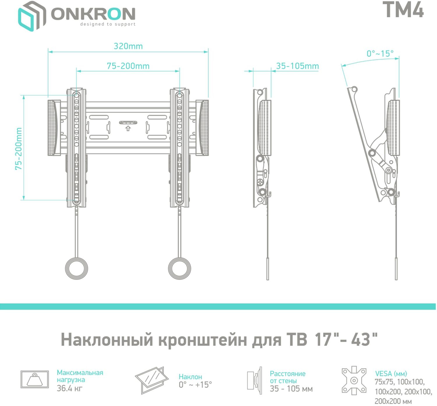 Настенный кронштейн ONKRON TM4 предназначен для телевизоров с диагональю от 17 до 43 дюймов . Максимальный выдерживаемый вес составляет 36.5 кг.