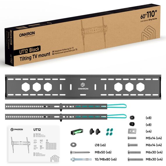 Настенный кронштейн для телевизоров и интерактивных панелей ONKRON UT12 черный Наклонный кронштейн для телевизора UT12 – это ультрасовременный кронштейн для крупногабаритных экранов и интерактивных панелей, который может использоваться вместе с самыми топовыми телевизорами.