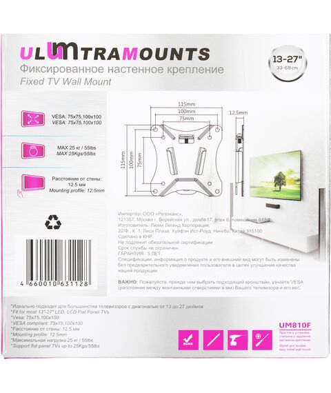 Кронштейн для телевизора Ultramounts UM810F черный 13"-27" макс.25кг настенный фиксированный