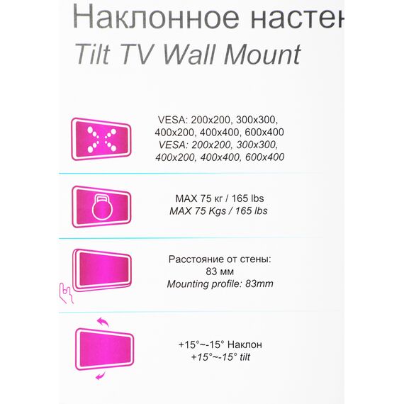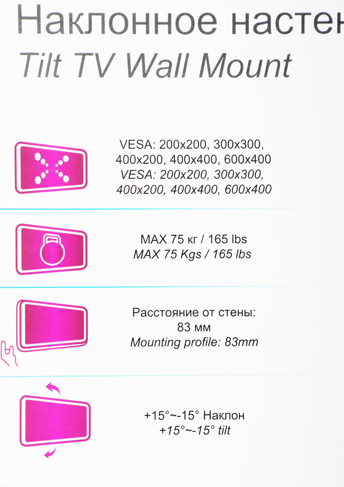 | Подходит для телевизоров c диагональю | 37", 39", 40", 42", 46", 48", 50", 52", 55", 60", 65", 70", 75" |
