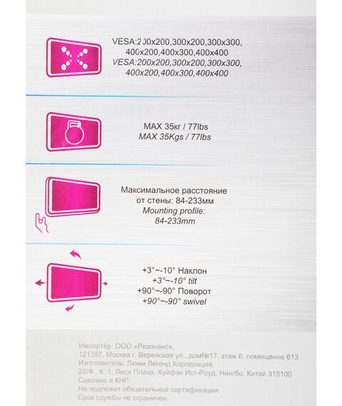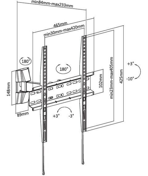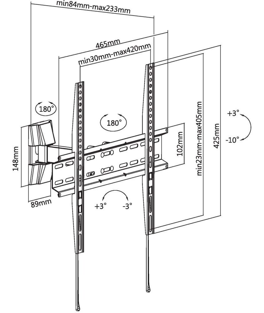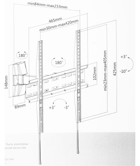 Сверхпрочный рукав кронштейна обладает большой грузоподъемностью. Регулируются углы наклона, подъема и поворота. Выпадающие шнуры обеспечивают легкие монтаж и демонтаж телевизора. Есть возможность отрегулировать положение дисплея по часовой и против часовой стрелки на 3 после завершения монтажа.