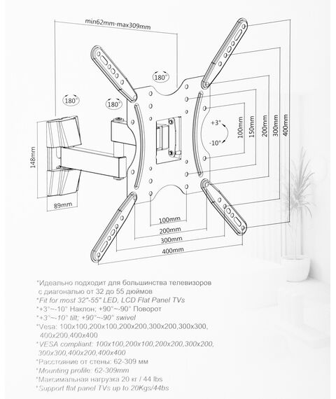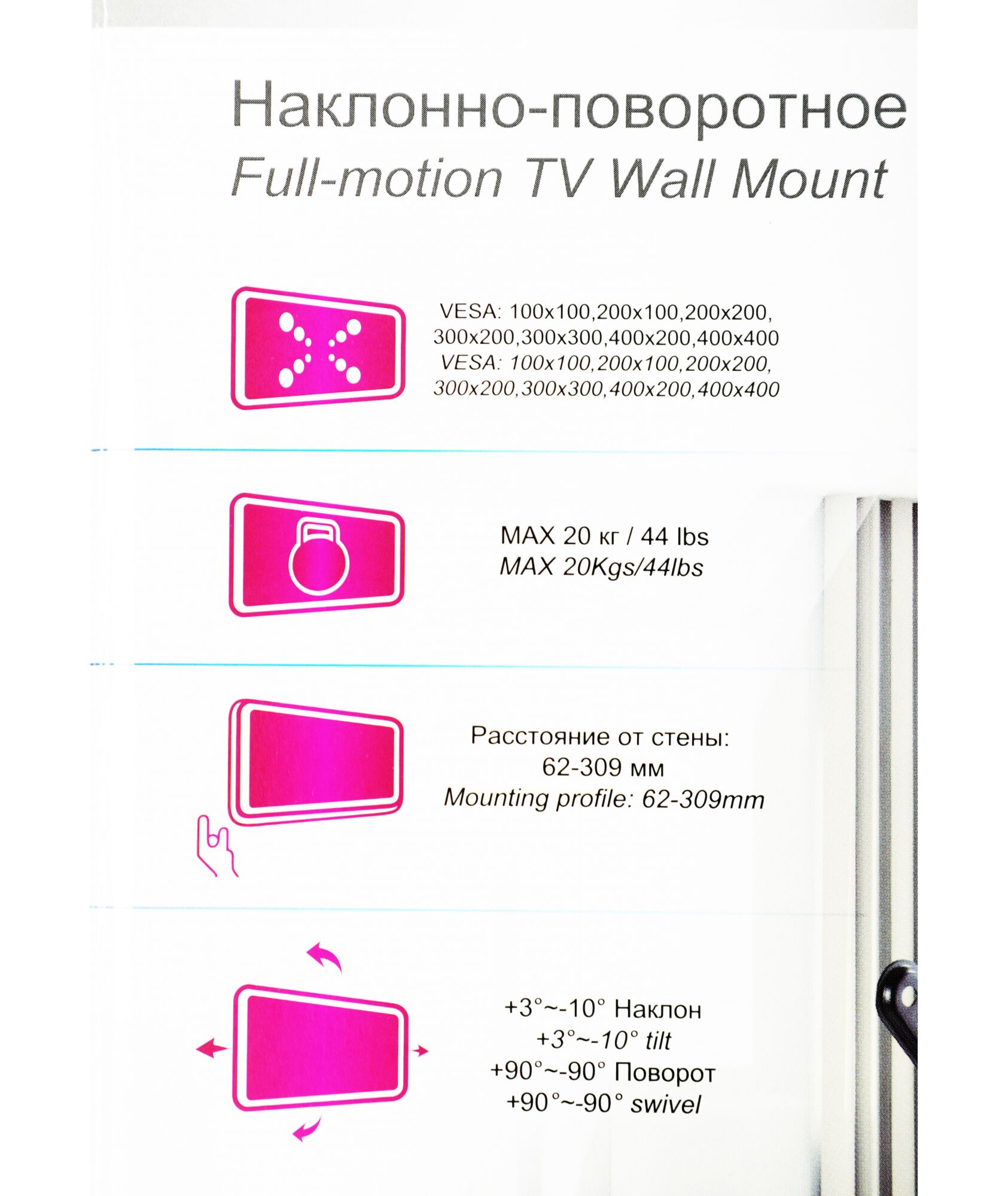 | Подходит для телевизоров c диагональю | 32", 37", 39", 40", 42", 46", 48", 50", 52", 55" |
