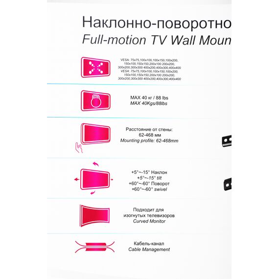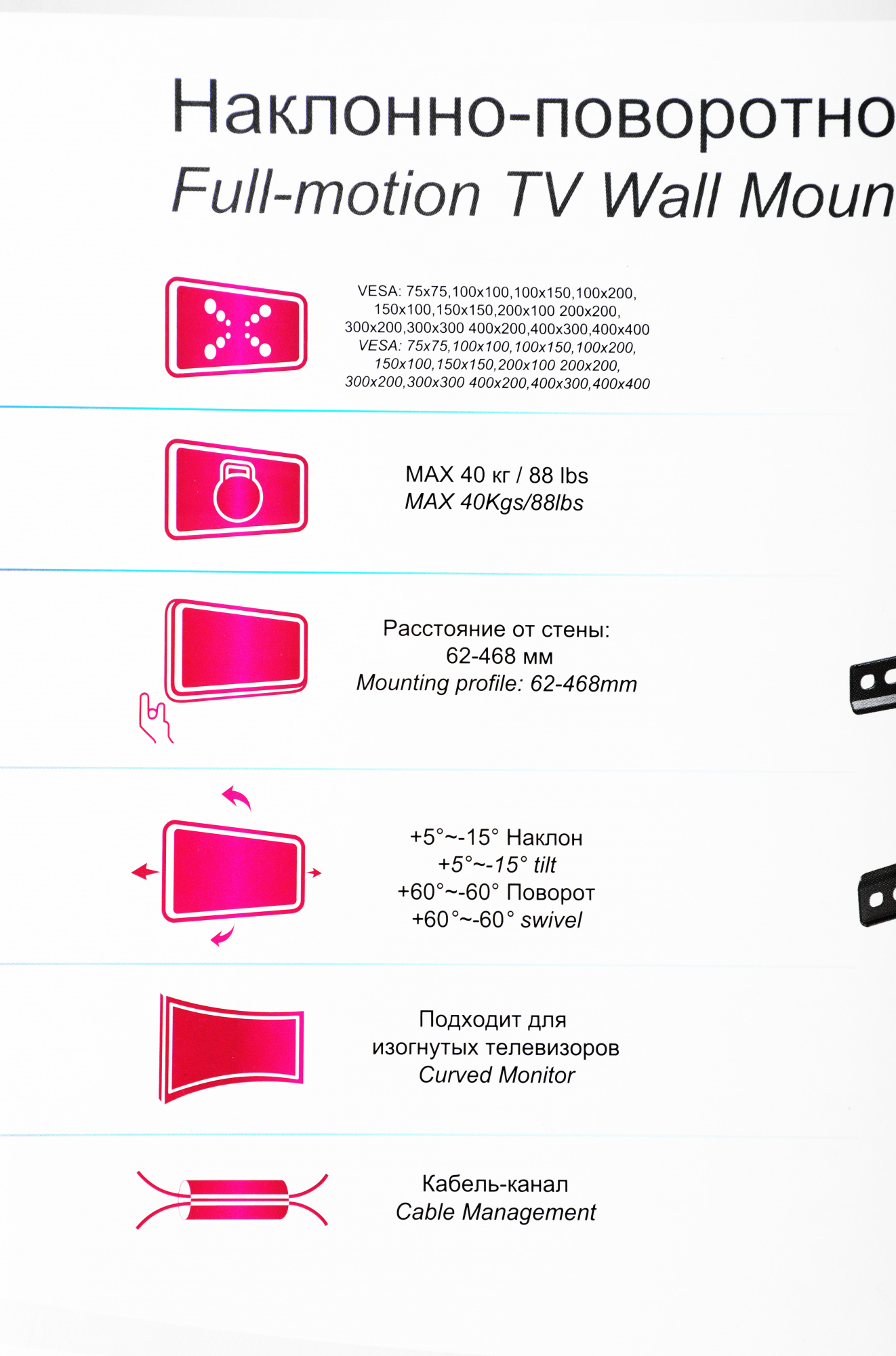 | Подходит для телевизоров c диагональю | 32", 37", 39", 40", 42", 46", 48", 50", 52", 55", 60", 65", 70", 75" |