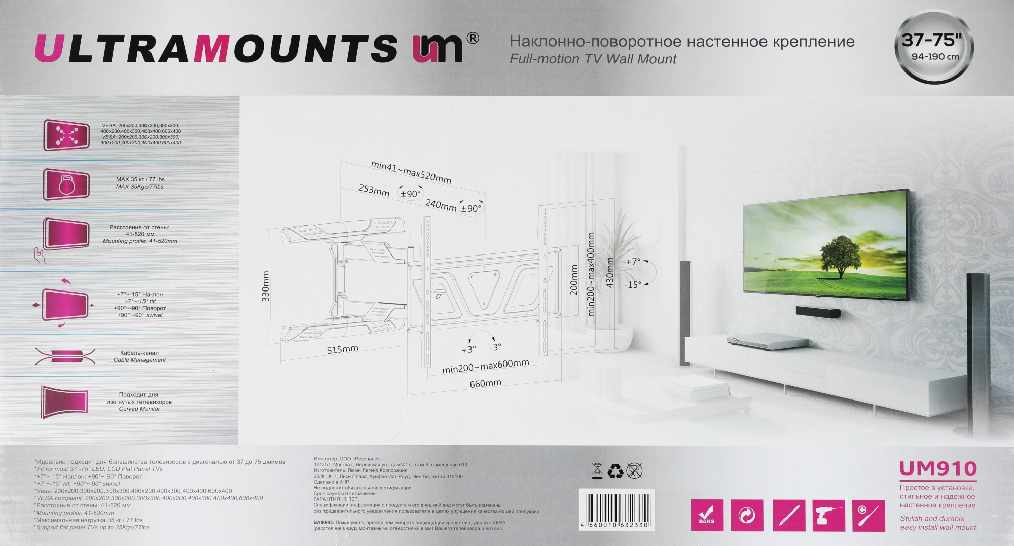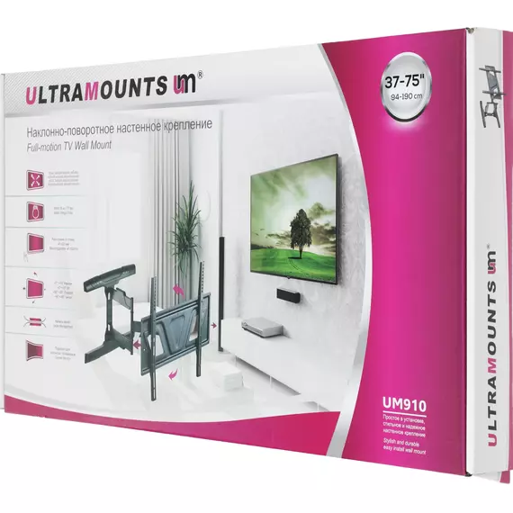 Кронштейн для телевизора Ultramounts UM910 черный 37"-75" макс.35кг настенный поворотно-выдвижной и наклонный
