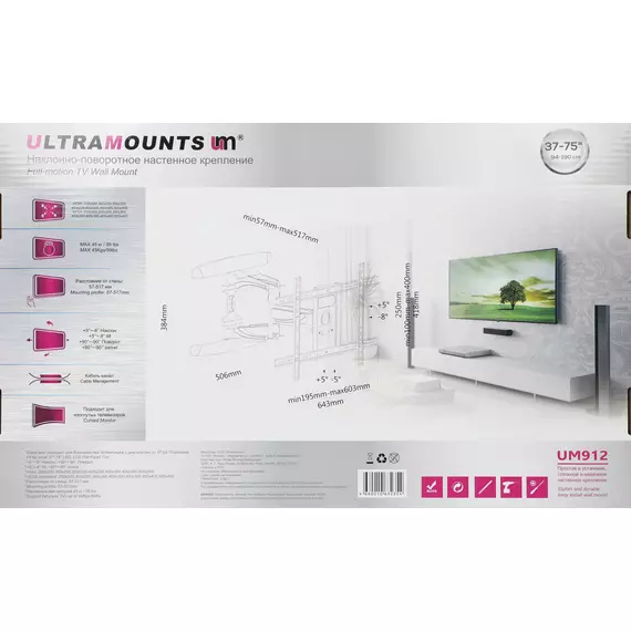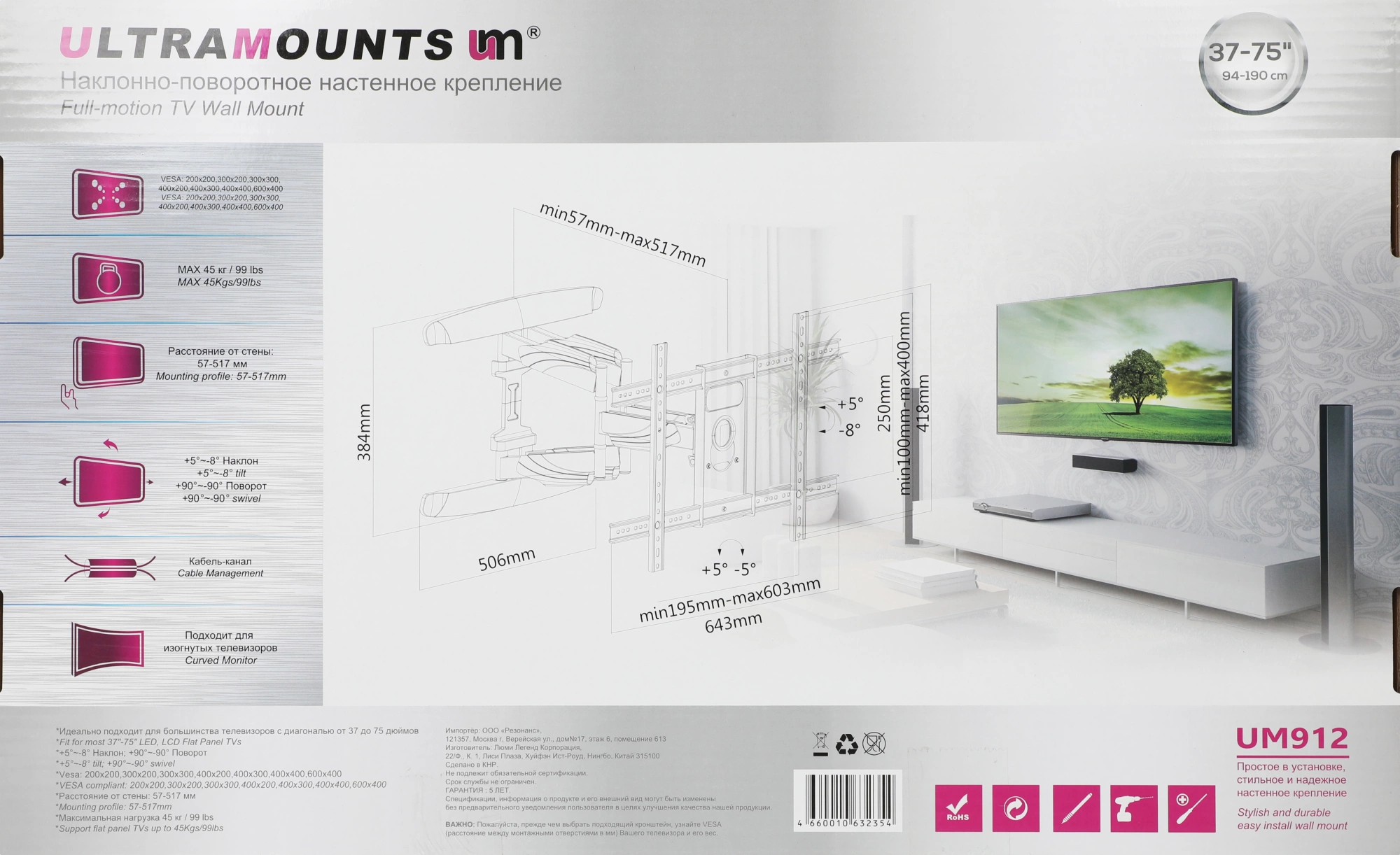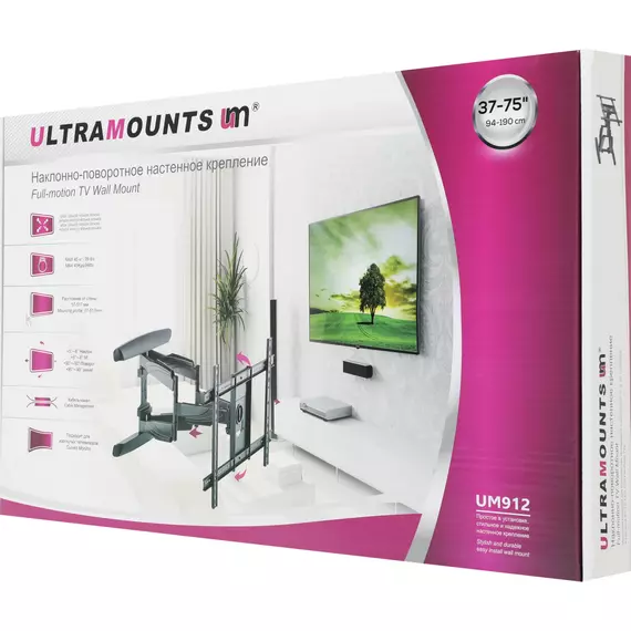 Кронштейн для телевизора Ultramounts UM912 черный 37"-75" макс.45кг настенный поворотно-выдвижной и наклонный