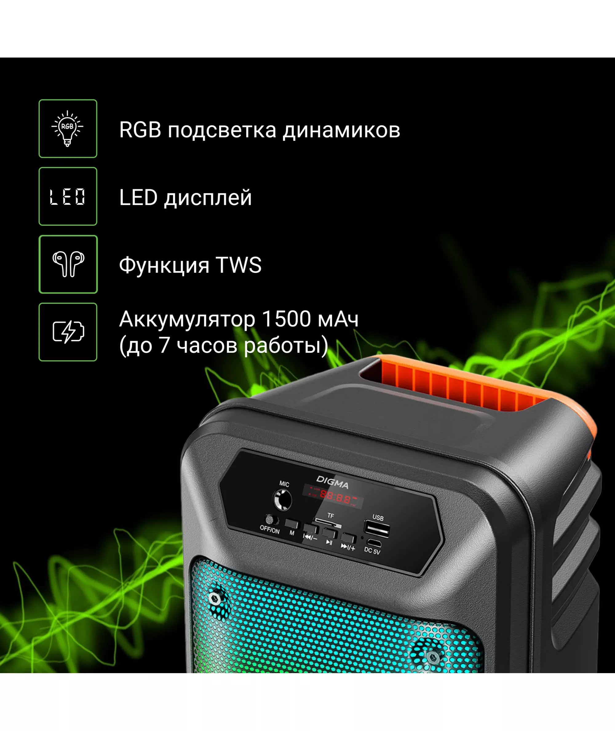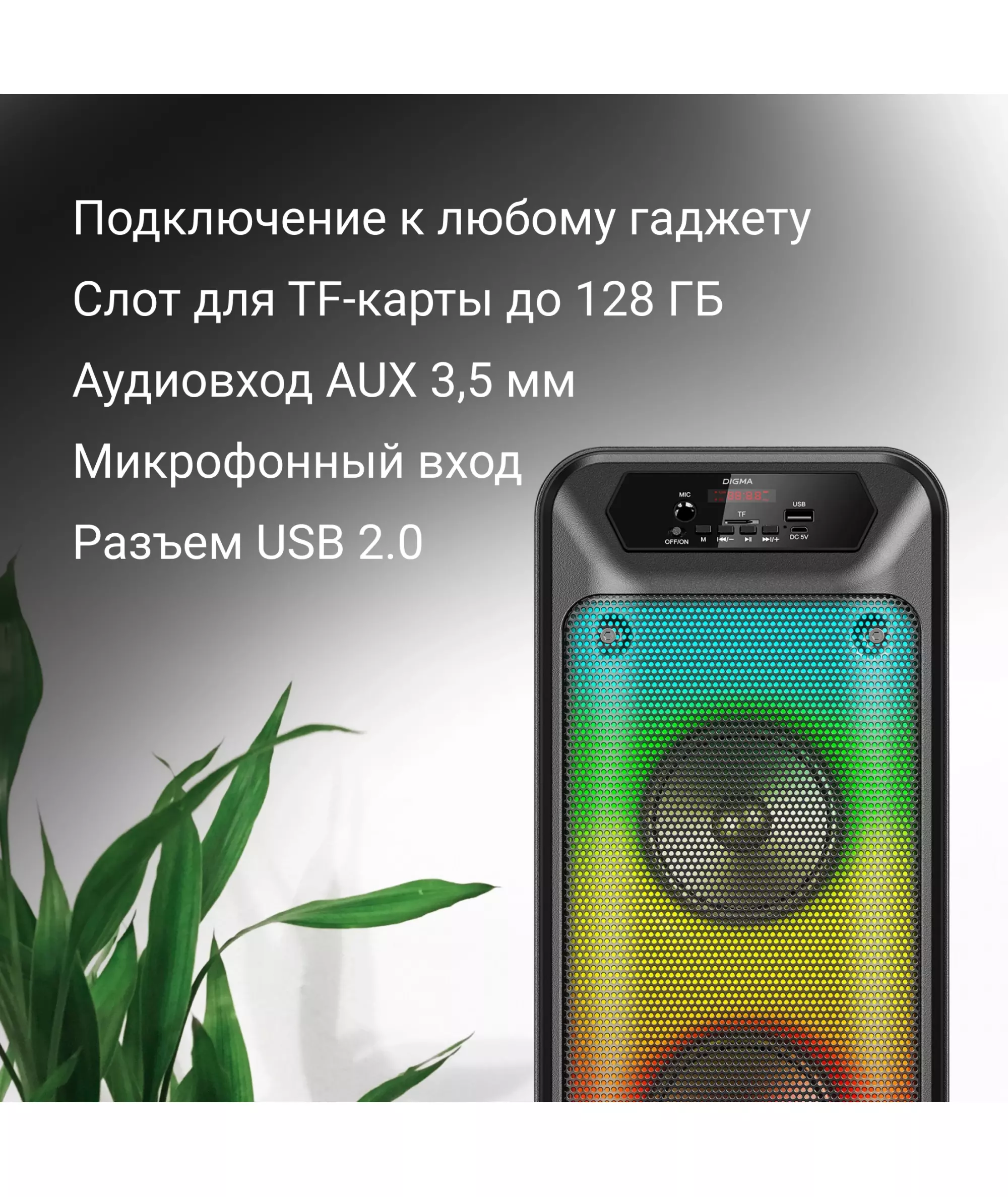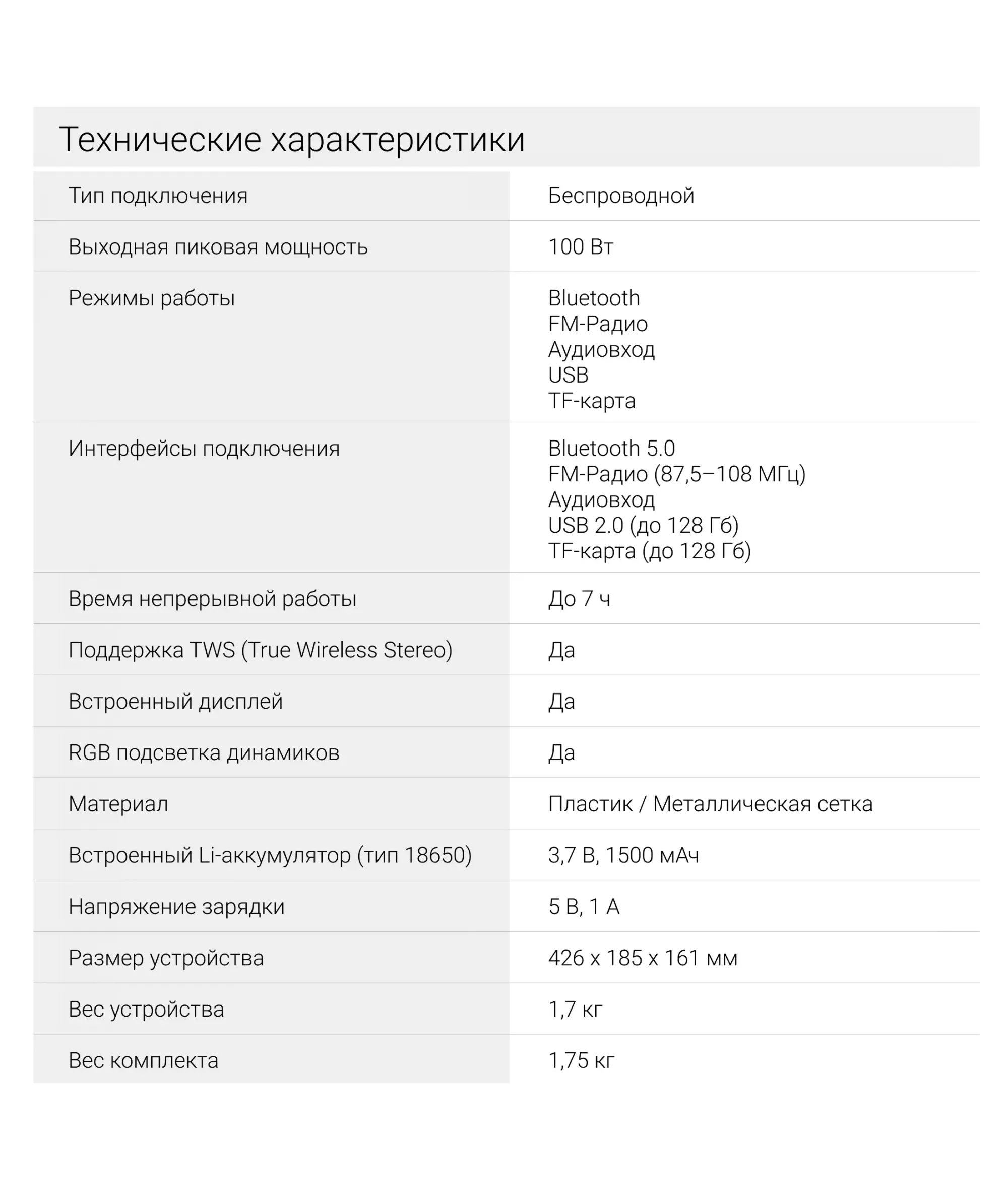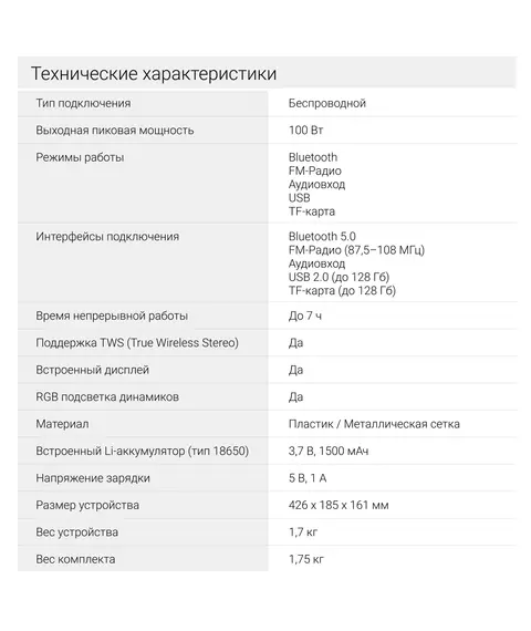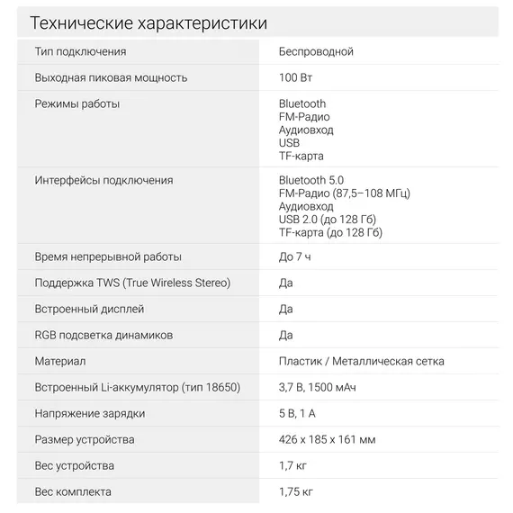 | Пиковая музыкальная выходная мощность (PMPO) | 100 Вт |