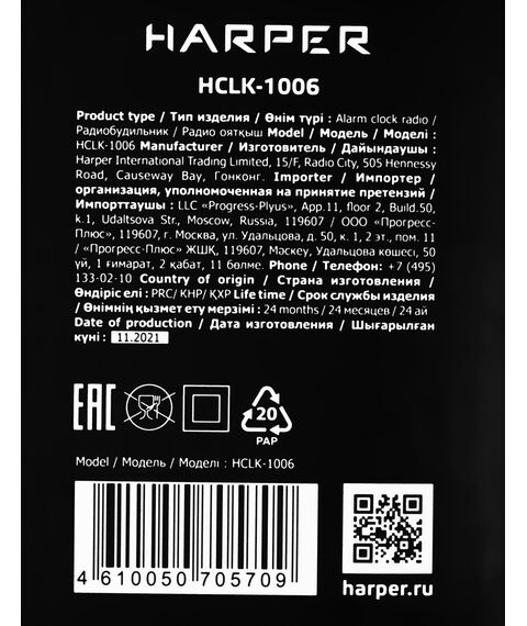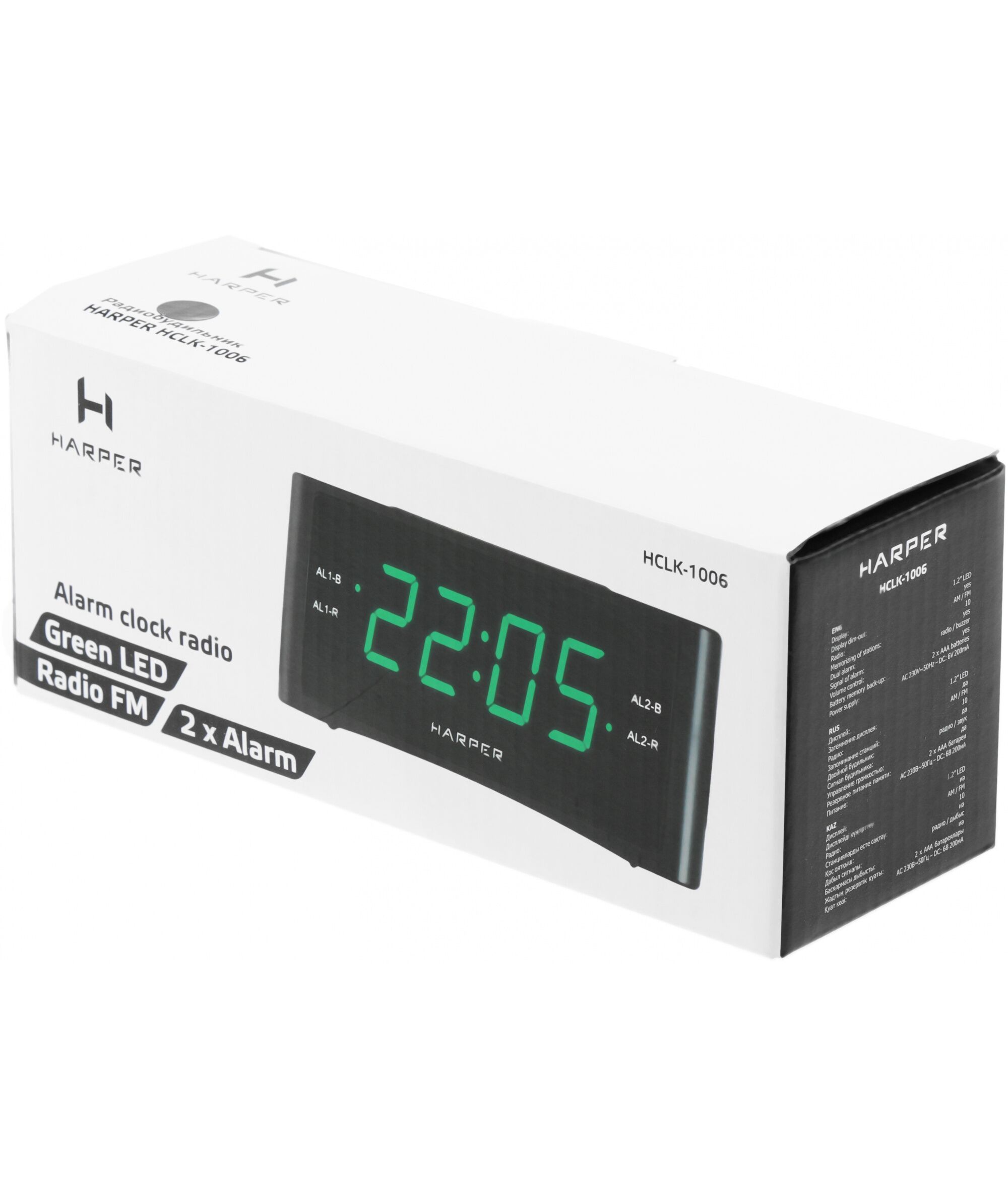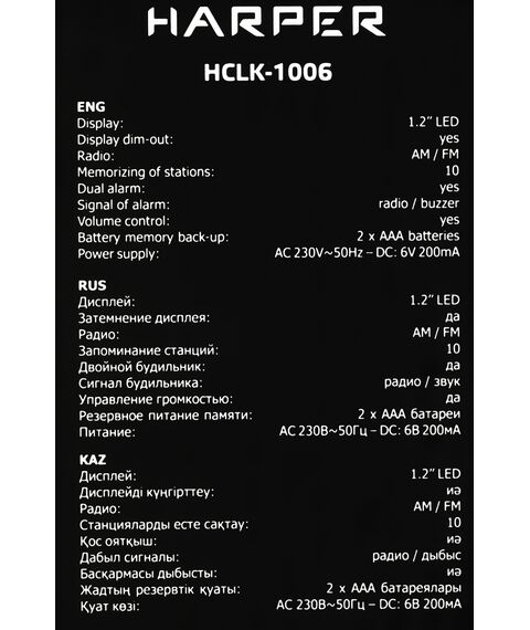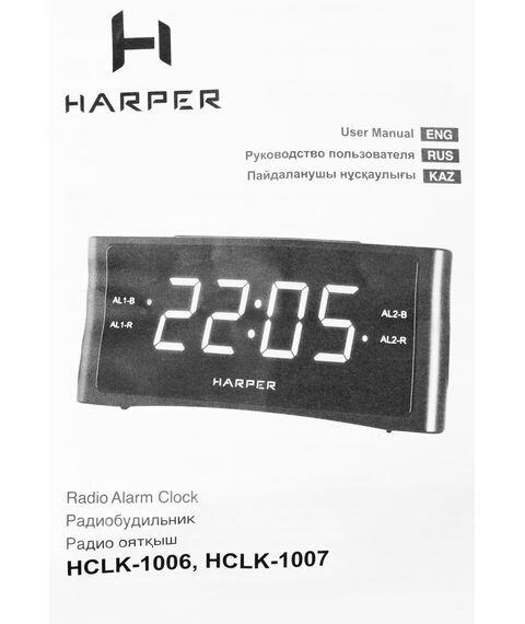 | Особенности | Два независимых будильника. Удобный ночник с гибко регулируемой подсветкой . Если вы любите засыпать под звуки радио, у Harper HCLK-1006 есть функция автоотключения (от 10 до 90 минут). В памяти можно сохранить до 20 каналов, любой из них можно выбрать вместо стандартной мелодии будильника. |