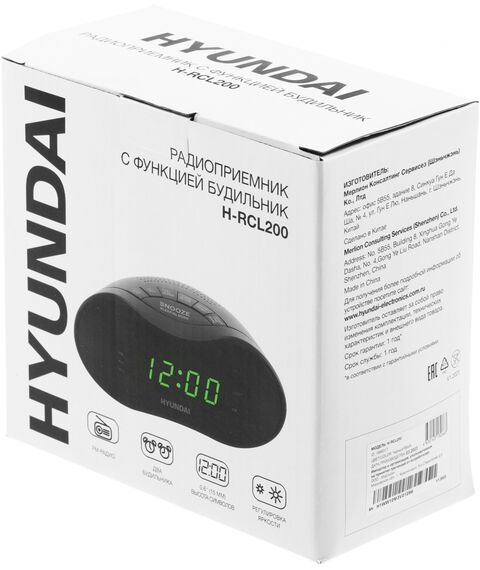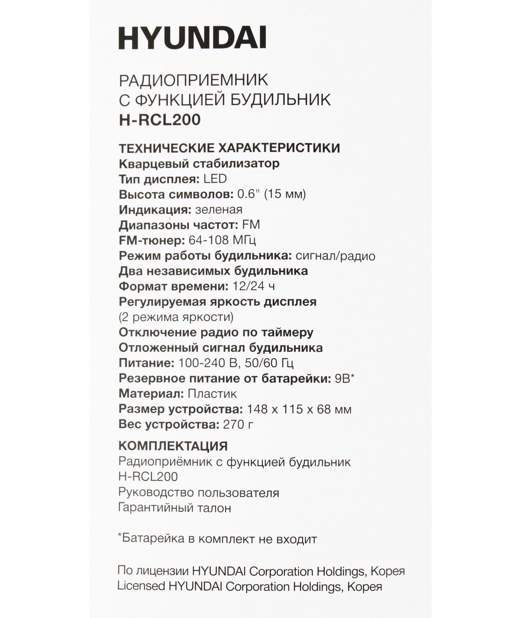 Радиобудильник Hyundai H-RCL200 черный LED подсв:зеленая часы:цифровые AM/FM