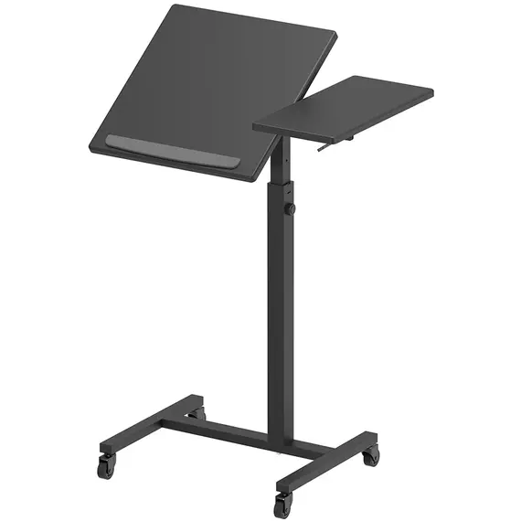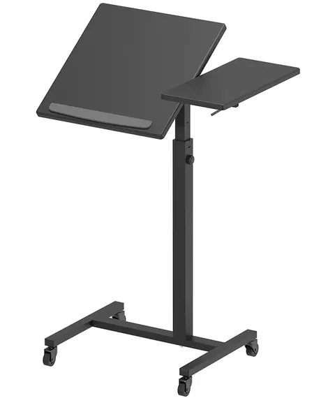 | Особенности | Стол-трансформер для ноутбука, проектора на колёсах. Регулировка высоты 720-920 мм, Размер наклонной секции: 40х40 см, Размер фиксированной секции: 40х19,5 см, 4 колеса (два колеса со стопорами) |