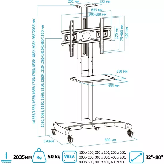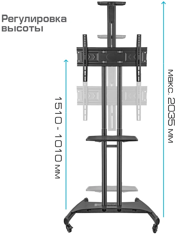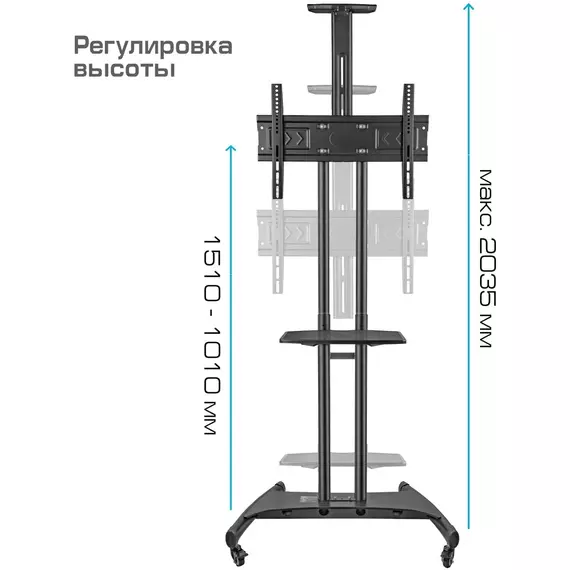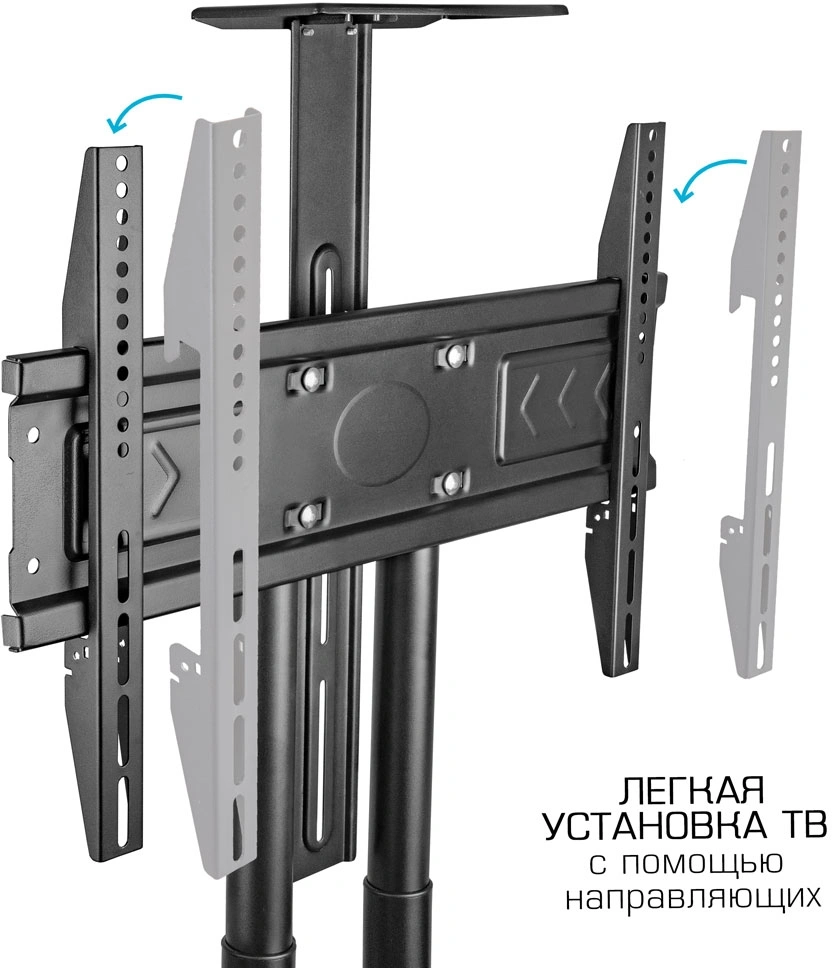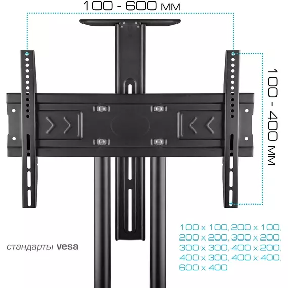 | Особенности | Универсальная система крепления для любого телевизора с посадочными отверстиями по горизонтали от 100 мм до 600 мм, по вертикали от 100 мм до 400 мм, Надежная стальная конструкция, Регулируемая высота до 2035 мм, Кабель канал удобная прокладка соединительных кабелей внутри штанги |