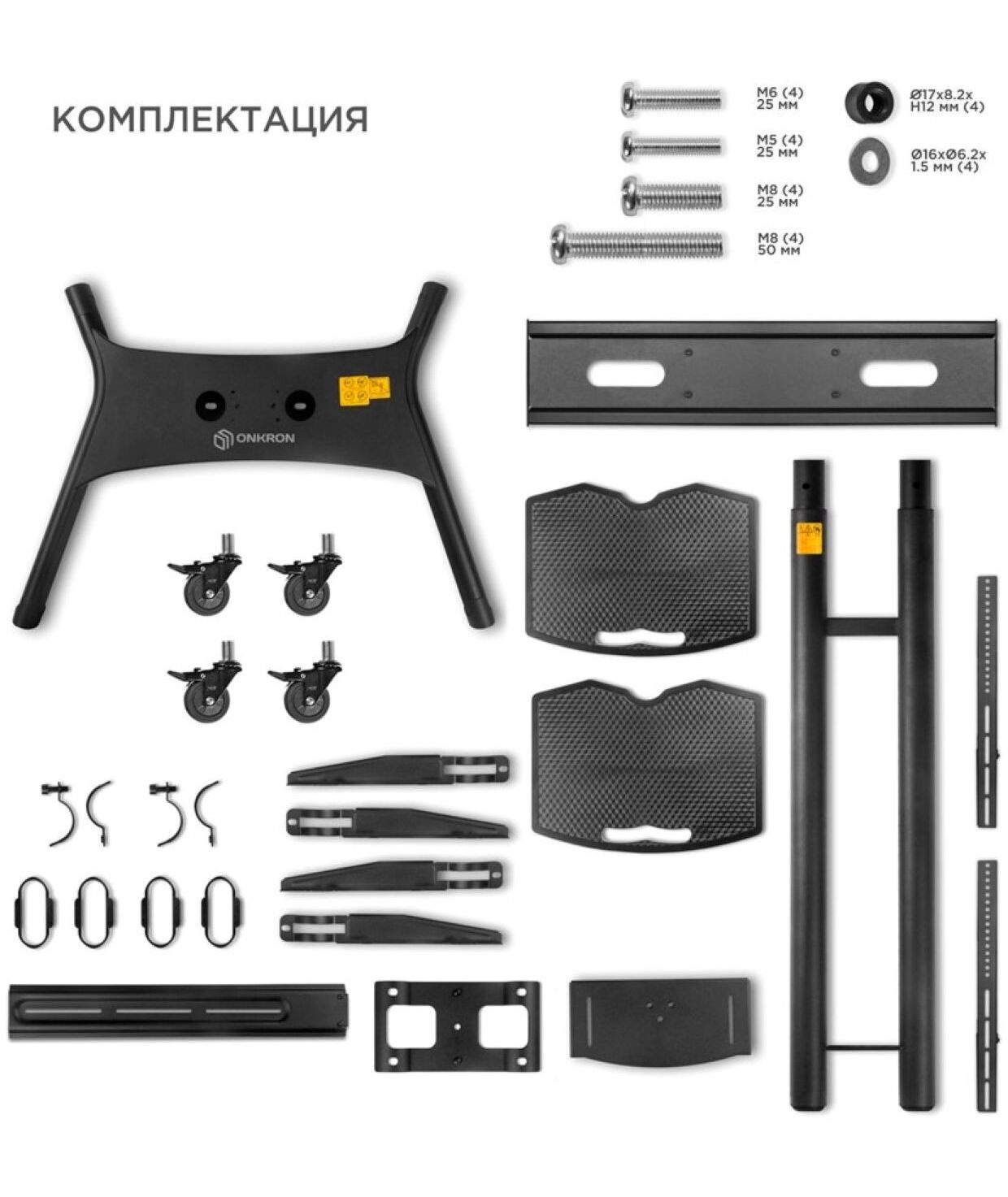 Мобильная напольная стойка ONKRON TS1881 подходит для телевизоров любых производителей, среди которых SAMSUNG, LG, Xiaomi. Предусмотренная диагональ ТВ – от 50 до 86 дюймов, максимальный вес – 90, 9 кг.
