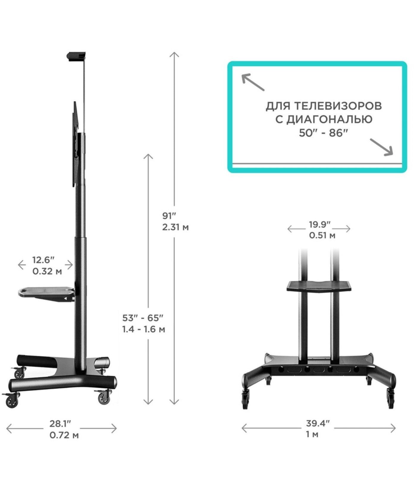 | Особенности | Различные варианты крепления VESA. Простая и быстрая настройка высоты. Встроенный кабель-канал .Полки для дополнительной техники. Идеальна для экономии места. Надёжные колёса с системой фиксации. |