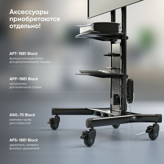 Высококачественные колеса с резиновым покрытием обеспечивают плавное и легкое передвижение стойки на любой поверхности, при этом не оставляя никаких следов. Колеса можно заблокировать, чтобы предотвратить нежелательное движение стойки и обеспечить максимальную безопасность вашего телевизора.