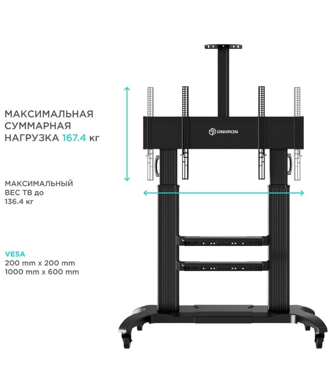 | Особенности | Раздвижное основание.Различные варианты крепления VESA. Инновационная конструкция. Встроенный кабель-канал .Полка для дополнительной техники. Надёжные колёса с системой фиксации. |