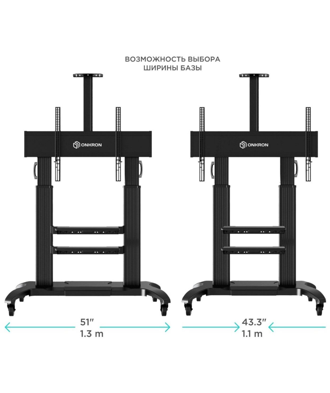Представляем Вашему вниманию стойку с уникальной конструкцией ONKRON TS2811. Уникальность её в том, что данная мобильная стойка подходит не только для телевизоров и интерактивных досок, диагональю от 60" до 100" и весом не более 136,4 кг, но и в том, что она имеет регулировку ширины основания.