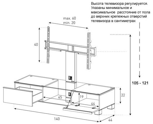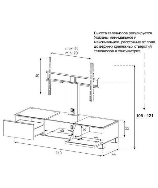 Надежная стойка под большие телевизоры с универсальным поворотным креплением из закаленного стекла с закругленными углами и полированной кромкой. Поворотное крепление подходит для всех видов плоских телевизоров (LCD, LED и плазма) и имеет возможность регулировки высоты. В задней ножке расположен кабель-канал для маскировки проводов и кабелей. Оснащена скрытой роликовой системой для плавного перемещения ТВ стойки вместе с телевизором и другой аппаратурой. Стойка предназначена для телевизоров с диагональю 32-75 дюймов (весом до 50 кг). Крепление поддерживает форматы 20x20, 30x30, 40x40 и 60х40. Возможно оснащение увеличенным креплением (80x45). Выдвижной ящик оснащен системой мягкого и бесшумного закрытия