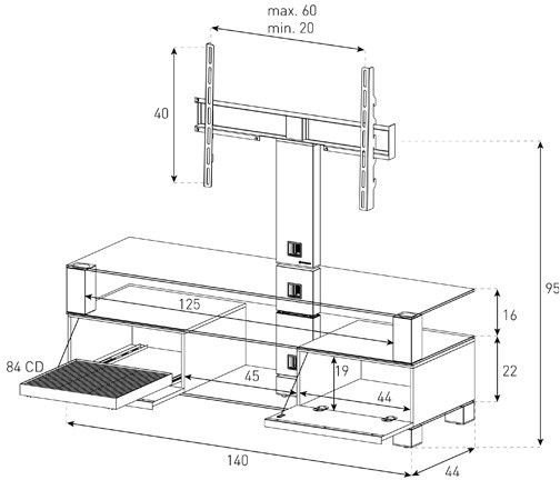 Надежная стойка под большие телевизоры с универсальным поворотным креплением из закаленного стекла с закругленными углами и полированной кромкой. Поворотное крепление подходит для всех видов плоских телевизоров (LCD, LED и плазма) и имеет возможность регулировки высоты. В задней ножке расположен кабель-канал для маскировки проводов и кабеле. Оснащена скрытой роликовой системой для плавного перемещения ТВ стойки вместе с телевизором и другой аппаратурой. Стойка предназначена для телевизоров с диагональю 32-75 дюймов (весом до 50 кг). Крепление поддерживает форматы 20x20, 30x30, 40x40. Возможно оснащение увеличенным крепление (80x45). Выдвижной ящик оснащен системой мягкого и бесшумного закрытия.