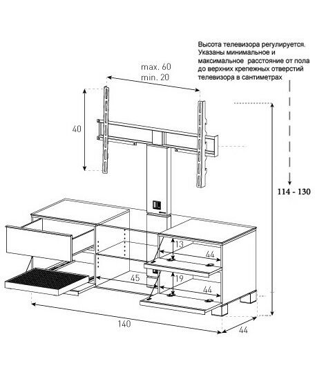 Надежная стойка под большие телевизоры с универсальным поворотным креплением из закаленного стекла с закругленными углами и полированной кромкой. Поворотное крепление подходит для всех видов плоских телевизоров (LCD, LED и плазма) и имеет возможность регулировки высоты. В задней ножке расположен кабель-канал для маскировки проводов и кабеле. Оснащена скрытой роликовой системой для плавного перемещения ТВ стойки вместе с телевизором и другой аппаратурой. Стойка предназначена для телевизоров с диагональю 32-75 дюймов (весом до 50 кг). Крепление поддерживает форматы 20x20, 30x30, 40x40. Возможно оснащение увеличенным крепление (80x45). Выдвижной ящик оснащен системой мягкого и бесшумного закрытия.