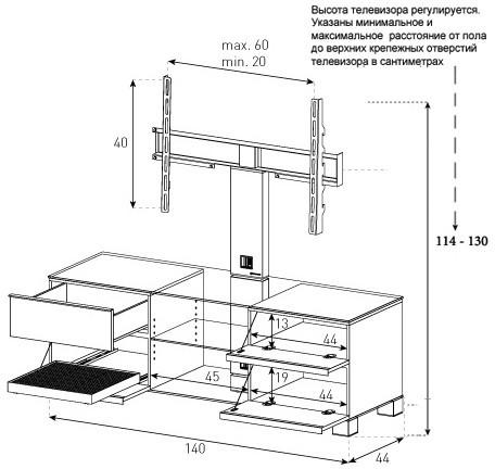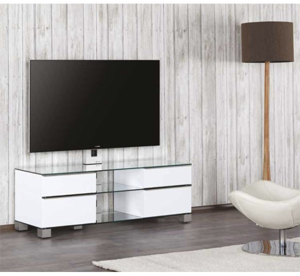 Надежная стойка под большие телевизоры с универсальным поворотным креплением из закаленного стекла с закругленными углами и полированной кромкой. Поворотное крепление подходит для всех видов плоских телевизоров (LCD, LED и плазма) и имеет возможность регулировки высоты. В задней ножке расположен кабель-канал для маскировки проводов и кабеле. Оснащена скрытой роликовой системой для плавного перемещения ТВ стойки вместе с телевизором и другой аппаратурой. Стойка предназначена для телевизоров с диагональю 32-75 дюймов (весом до 50 кг). Крепление поддерживает форматы 20x20, 30x30, 40x40. Возможно оснащение увеличенным крепление (80x45). Выдвижной ящик оснащен системой мягкого и бесшумного закрытия.
