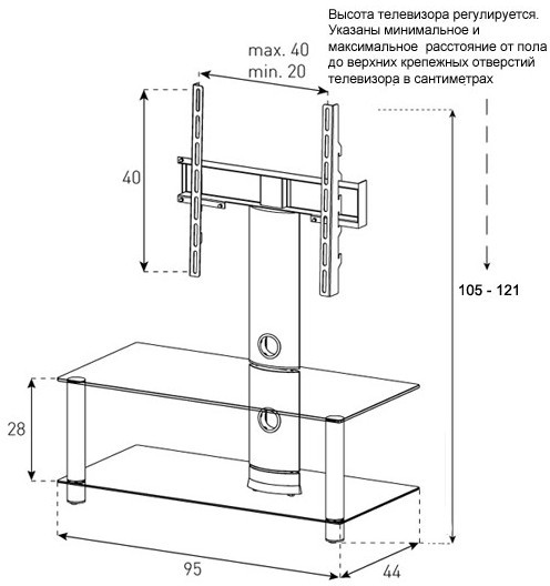 Надежная стойка под ТВ с жестким креплением станет элегантным и незаменимым элементом любого интерьера. Изготовлена из закаленного стекла и высококачественного алюминия. Поворотное крепление подходит для всех видов плоских телевизоров (LCD, LED и плазма). Есть кабель-канал для скрытия проводов и скрытые колесики для перемещения стойки. Стойка предназначена для телевизоров с диагональю 32-50 дюймов. Крепление поддерживает форматы 20x20, 30x30, 40x40