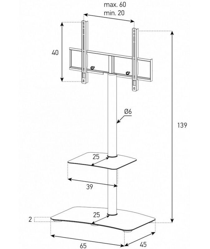 Надежная стойка под телевизоры с универсальным поворотным креплением из закаленного стекла с закругленными углами и полированной кромкой. Поворотное крепление подходит для всех видов плоских телевизоров (LCD, LED и плазма) и имеет возможность регулировки высоты. В задней ножке расположен кабель-канал для маскировки проводов и кабелей. Стойка предназначена для телевизоров с диагональю 37-65 дюймов (весом до 30 кг). Крепление поддерживает форматы 20x20, 30x30, 40x40, 60x40