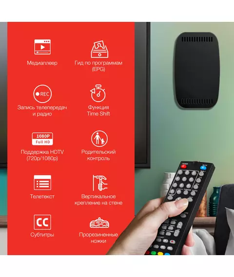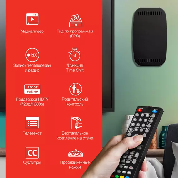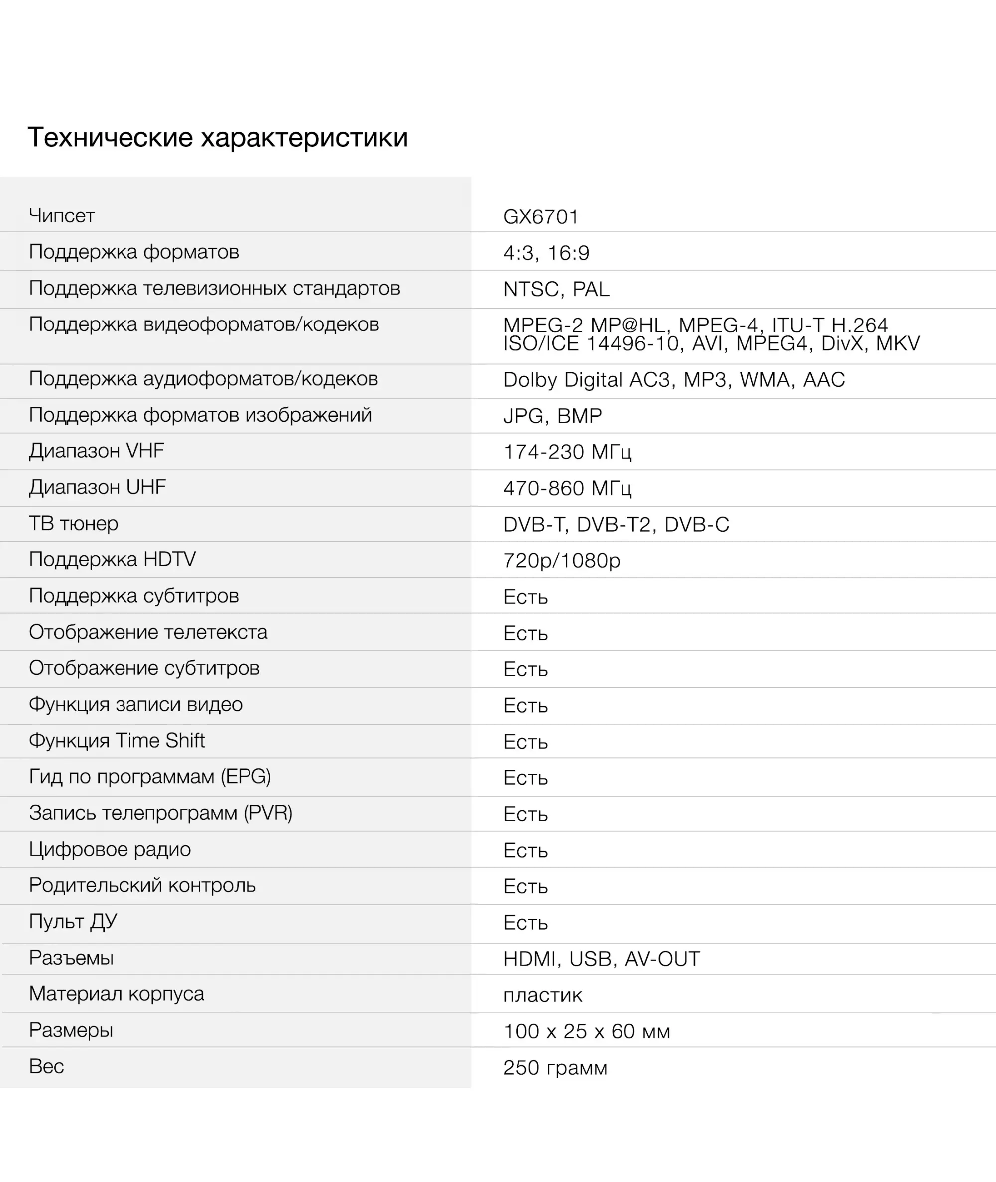 | Особенности | при подключении к интернету (USB WiFi адаптер на чипсете MTK MT7601 приобретается отдельно) доступны YouTube, Погода, RSS новости, IPTV, MEGOGO. В комплекте: ТВ-ресивер, пульт ДУ и батарейки к нему, видеокабель RCA, блок питания, инструкция |