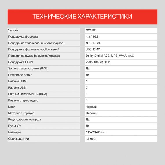 | Особенности | кнопки управления на корпусе, дисплей (каналы или часы). При подключении к интернету (USB WiFi адаптер на чипсете MTK MT7601 приобретается отдельно) доступны YouTube, Погода, RSS новости, IPTV, MEGOGO. В комплекте: ТВ-ресивер, пульт ДУ и батарейки к нему, видеокабель RCA, блок питания, инструкция |