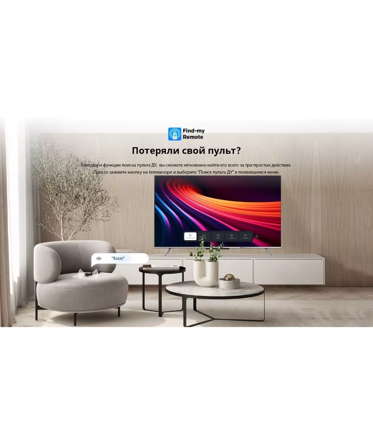 | Особенности | Матовый Экран, Технологии защиты зрения: Low Blue Light (сниженный синий свет), Flicker Free (антимерцание), Ночной Режим, Датчик окружающего освещения, Функция поиска ПДУ, Антибактериальный ПДУ, Режим Кинопроизводителя |