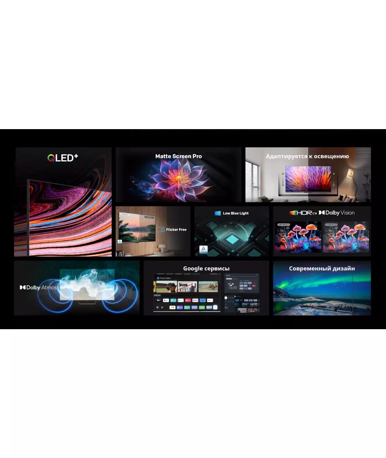 | Особенности | Матовый Экран, Технологии защиты зрения: Low Blue Light (сниженный синий свет), Flicker Free (антимерцание), Ночной Режим, Датчик окружающего освещения, Функция поиска ПДУ, Антибактериальный ПДУ, Режим Кинопроизводителя |