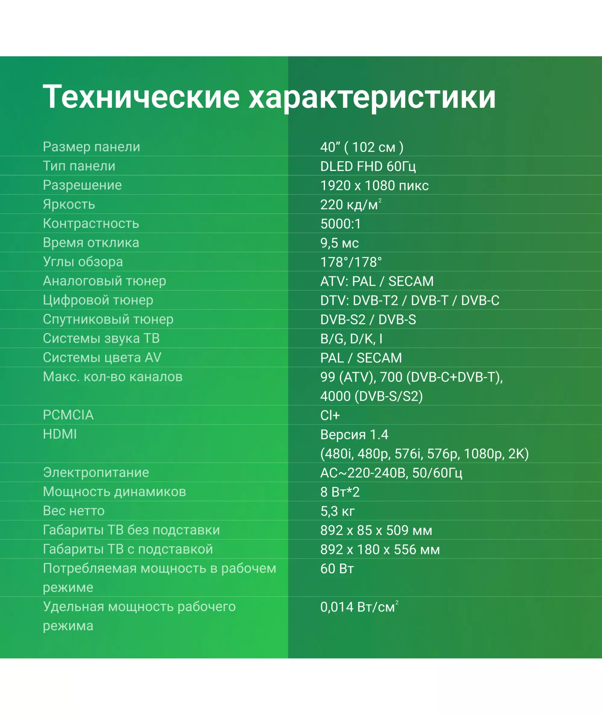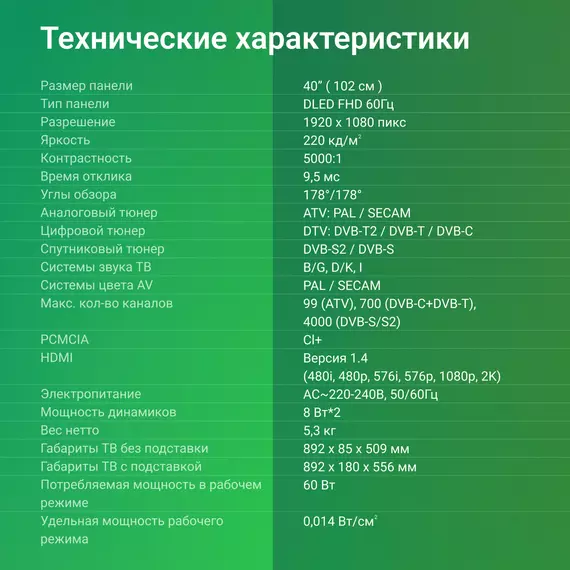 | Диагональ экрана (дюймы) | 40 " |