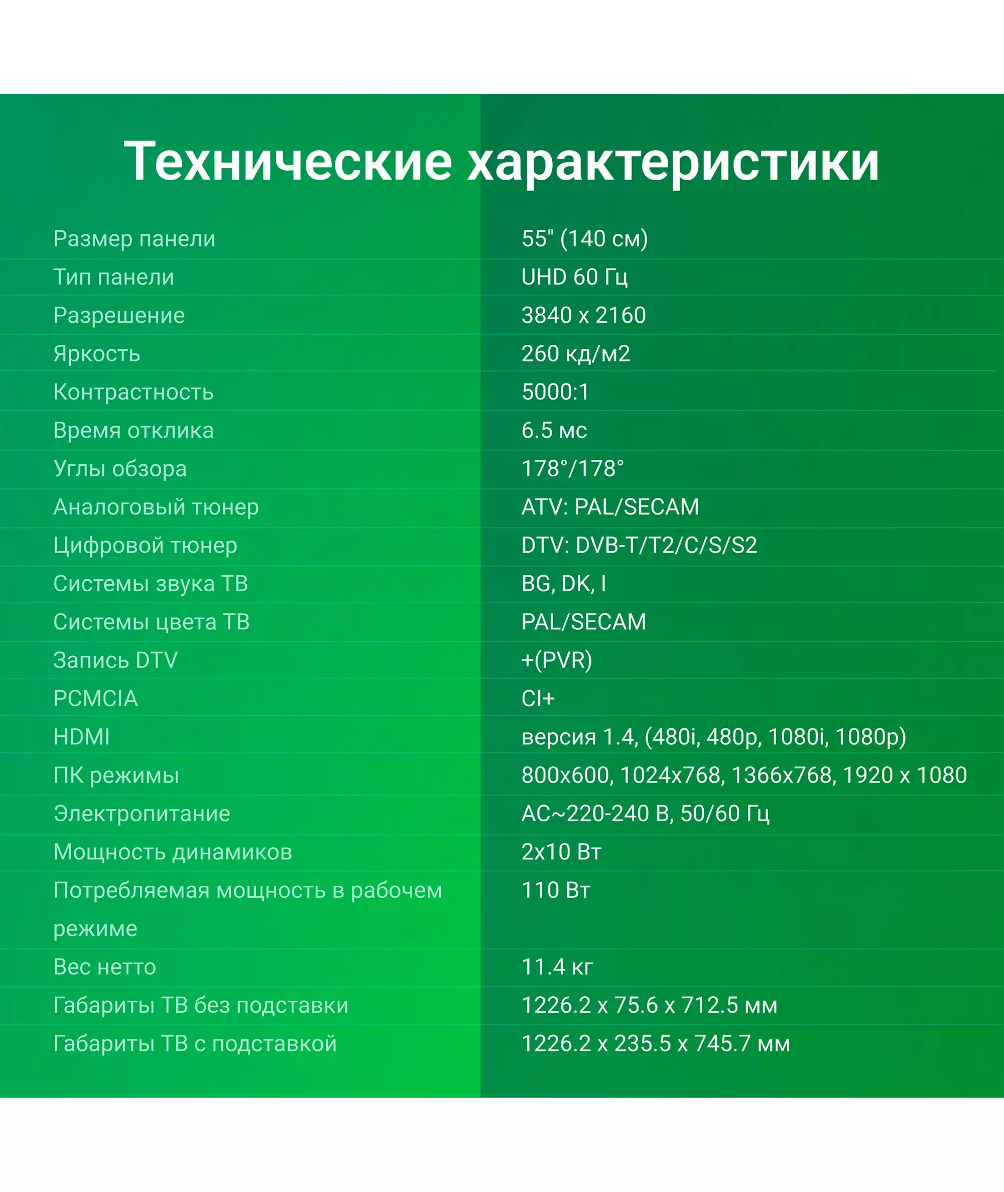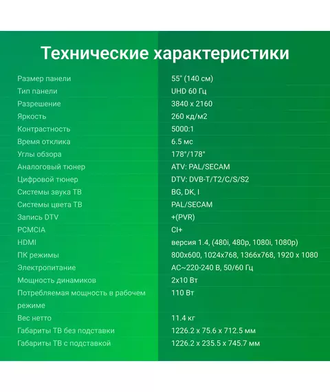 | Размеры без подставки | 1226.2x712.5x75.6мм |