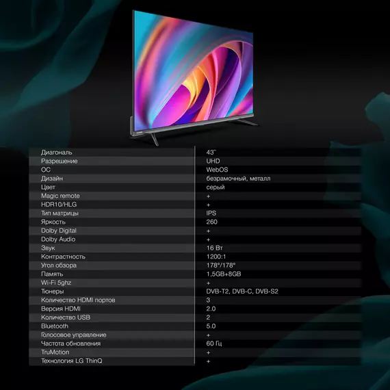 Телевизор Hyundai H-LED43BU7100 LED 43" WebOS Frameless Metal серый/серый 4K Ultra HD 60Hz MEMC DVB-T DVB-T2 DVB-C DVB-S DVB-S2 USB WiFi Smart TV