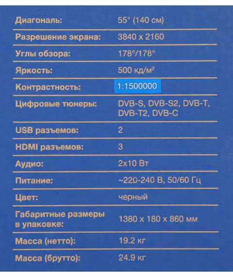 | Энергопотребление в режиме ожидания | 0.5 Вт |