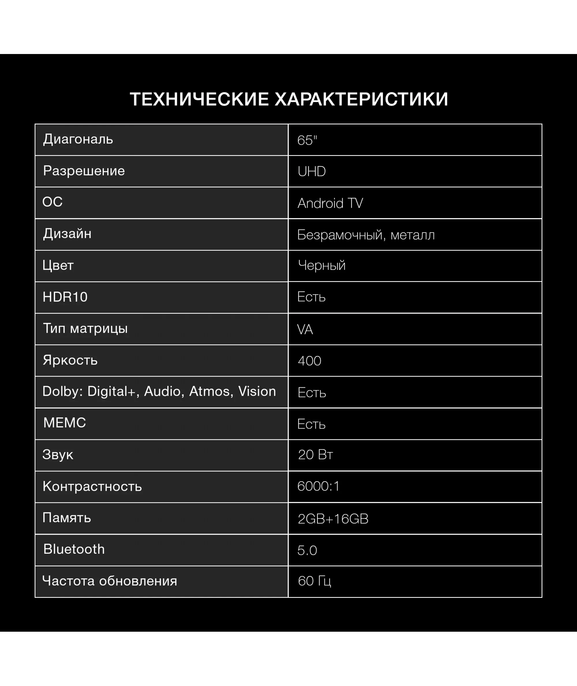 Телевизор Hyundai H-LED65BU7009 LED 65" Android TV Frameless Metal черный/черный 4K Ultra HD 60Hz DVB-T DVB-T2 DVB-C DVB-S DVB-S2 USB WiFi Smart TV