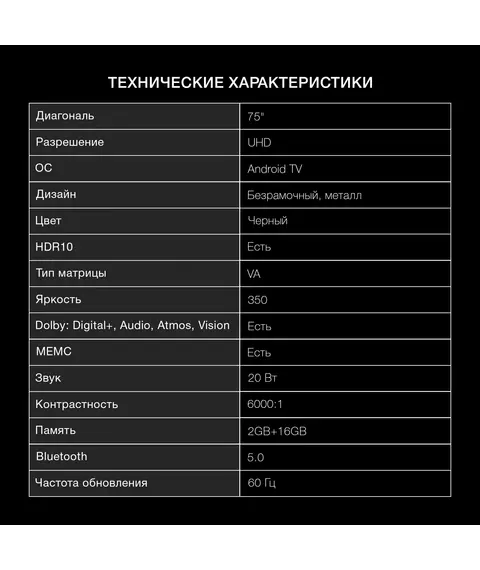 Телевизор Hyundai H-LED75BU7009 LED 75" Android TV Frameless черный 4K Ultra HD 60Hz DVB-T DVB-T2 DVB-C DVB-S DVB-S2 USB WiFi Smart TV