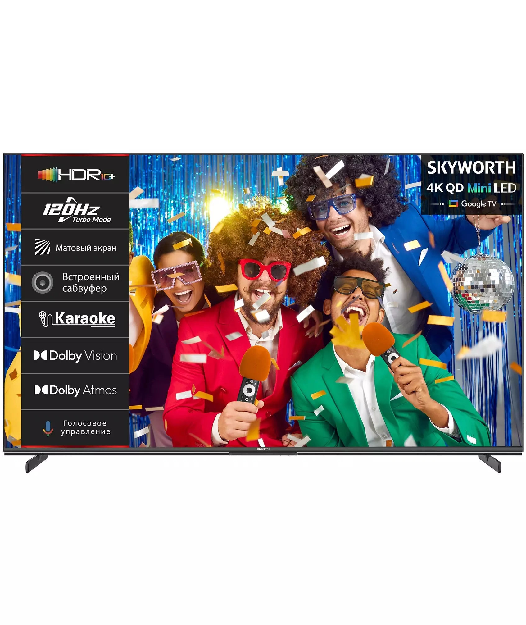 | Особенности | Караоке режим на базе ИИ через пульт ДУ; Встроенный сабвуфер и саундбар; Матовый экран с антибликовым покрытием; Режим Filmmaker Mode; Технологии защиты зрения: Low Blue Light (сниженный синий свет), Flicker Free (антимерцание); |