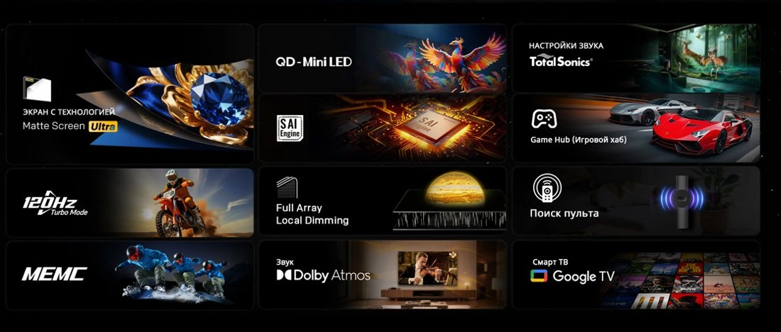 | Поддерживаемые технологии изображения | Dolby Vision; HDR10; HDR10+; HLG; MEMC; AI Motion Clarity; AI Skin Detection; Low Blue Light; Flicker Free |