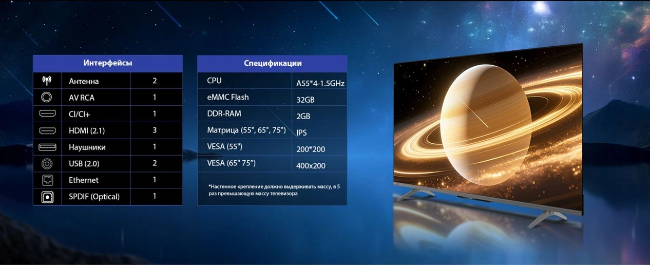 | Особенности дизайна | безрамочный дизайн, возможность крепления на стену |