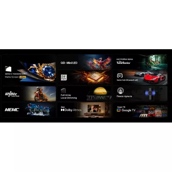 | Особенности | Адаптивный датчик освещенности; Трансляция экрана смартфона на ТВ; Режим Filmmaker Mode; Технология естественной передачи оттенков кожи AI Skin Detection с ИИ; Технология улучшения четкости AI Motion Clarity с ИИ, Технология MEMC; Технологии защиты зрения: Low Blue Light (сниженный синий свет); |