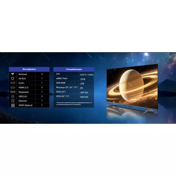 | Разъемы и интерфейсы | CI+/PCMCIA, HDMI, RJ-45 (Ethernet), S/PDIF (оптический), USB Type-A, для наушников, композитный (видео), стерео-аудио |