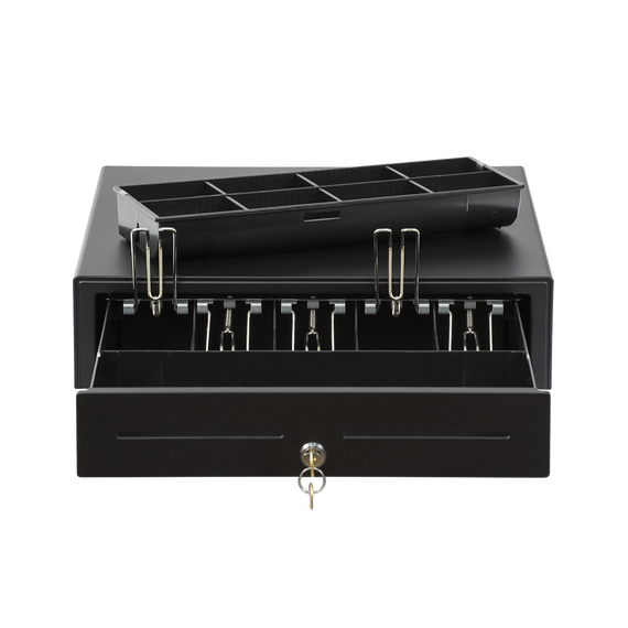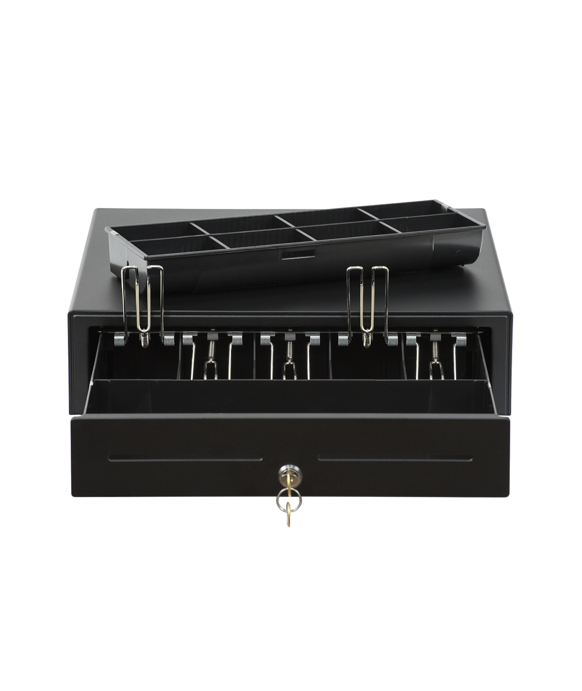 Корпус АТОЛ CD-410 выполнен из металла. В денежном ящике 5 отделений для купюр, 8 ячеек для монет и большое отделение для хранения чеков и счетов. Конструкция денежного ящика позволяет менять ширину отделений для купюр, а отделение для монет может выниматься из денежного ящика. Стальные зажимы для купюр долговечны и надежно фиксируют банкноты.