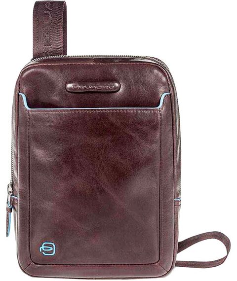 Вертикальная сумка на плечевом ремне Piquadro выполнена из телячьей кожи с легким глянцевым блеском и отделана голубым кантом. Одно основное отделение, отделение для mini Ipad, карман на молнии, съемное крепление для ключей.