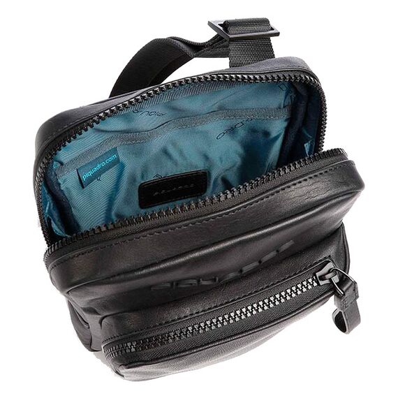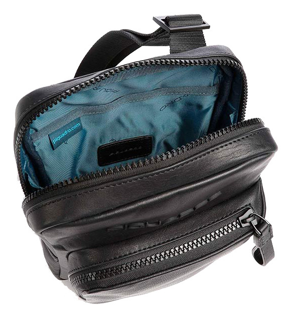 Вертикальная сумка на плечевом ремне Piquadro выполнена из натуральной телячьей кожи с легким глянцевым блеском и отделана голубым кантом. Одно основное отделение, отделение для mini Ipad, карман на молнии, съемное крепление для ключей.