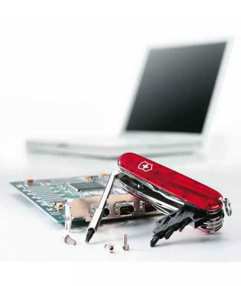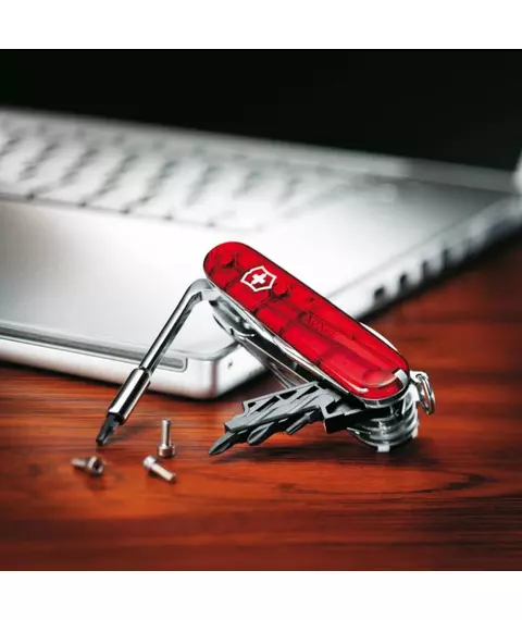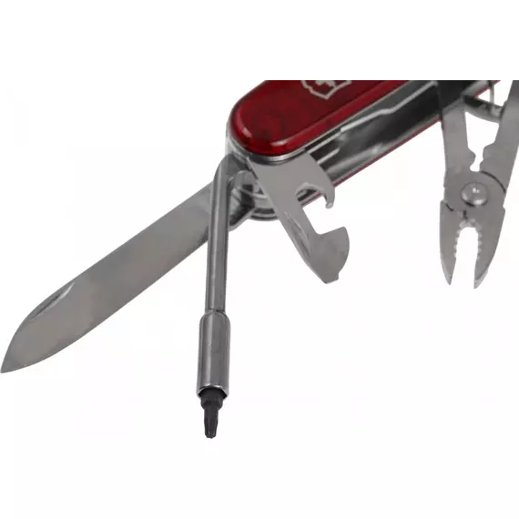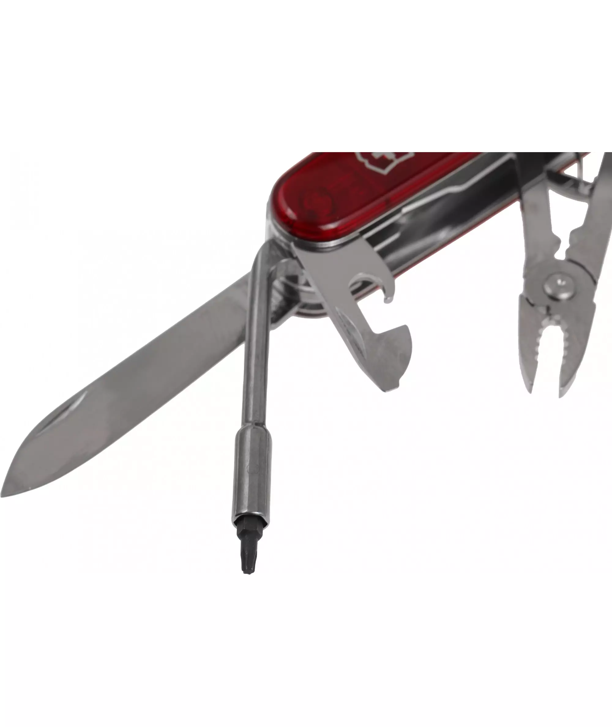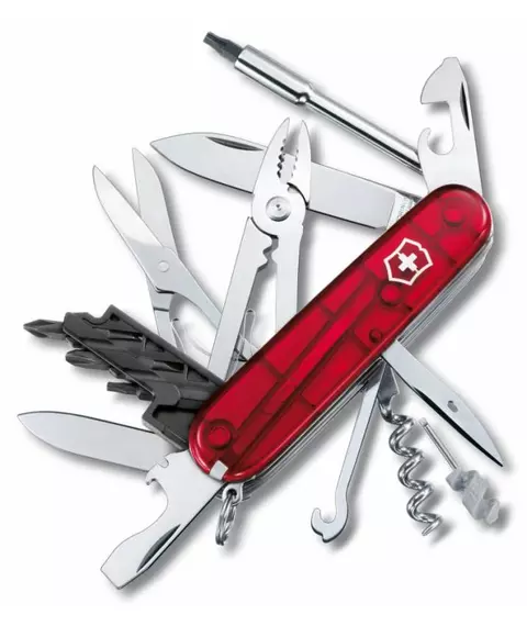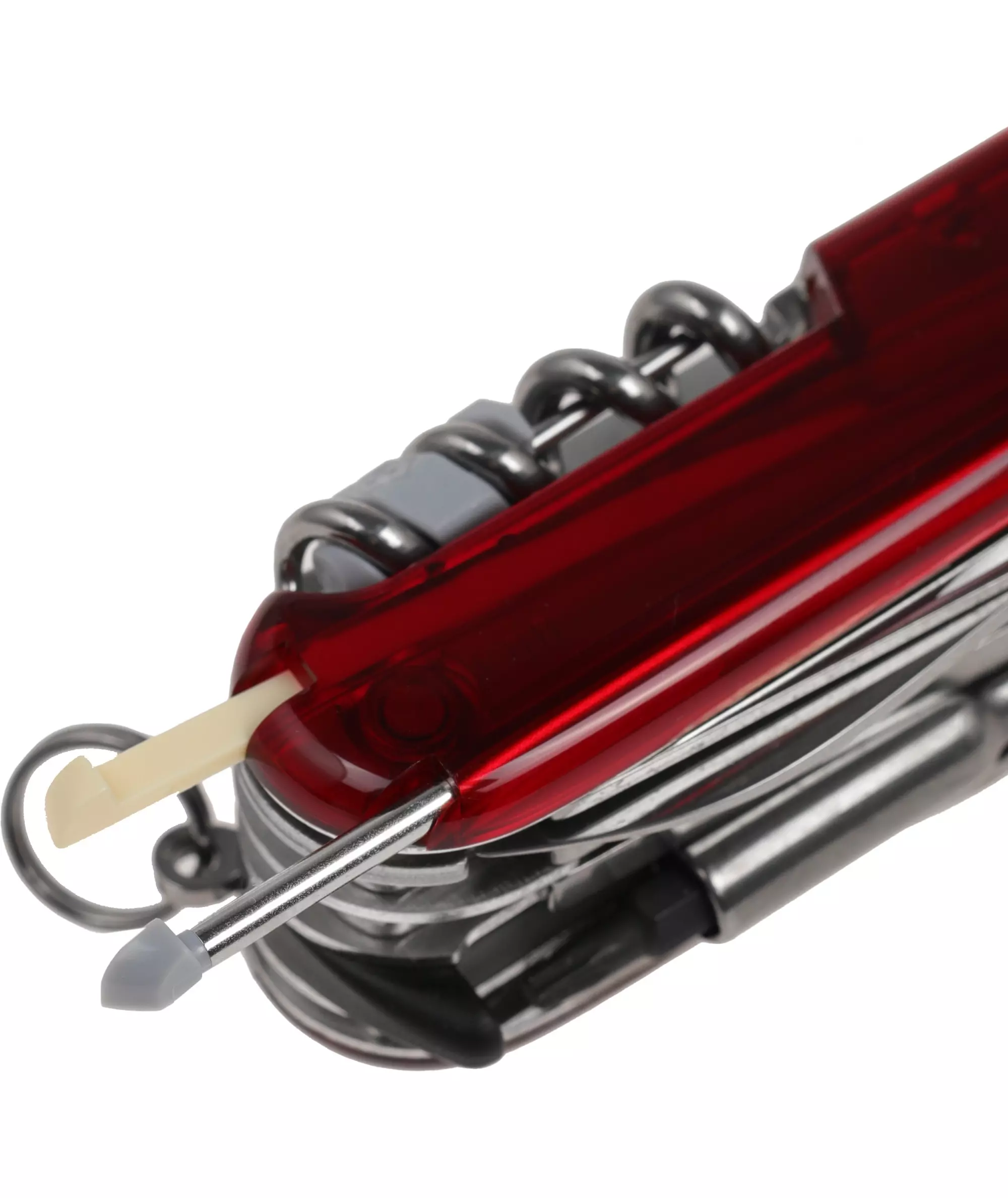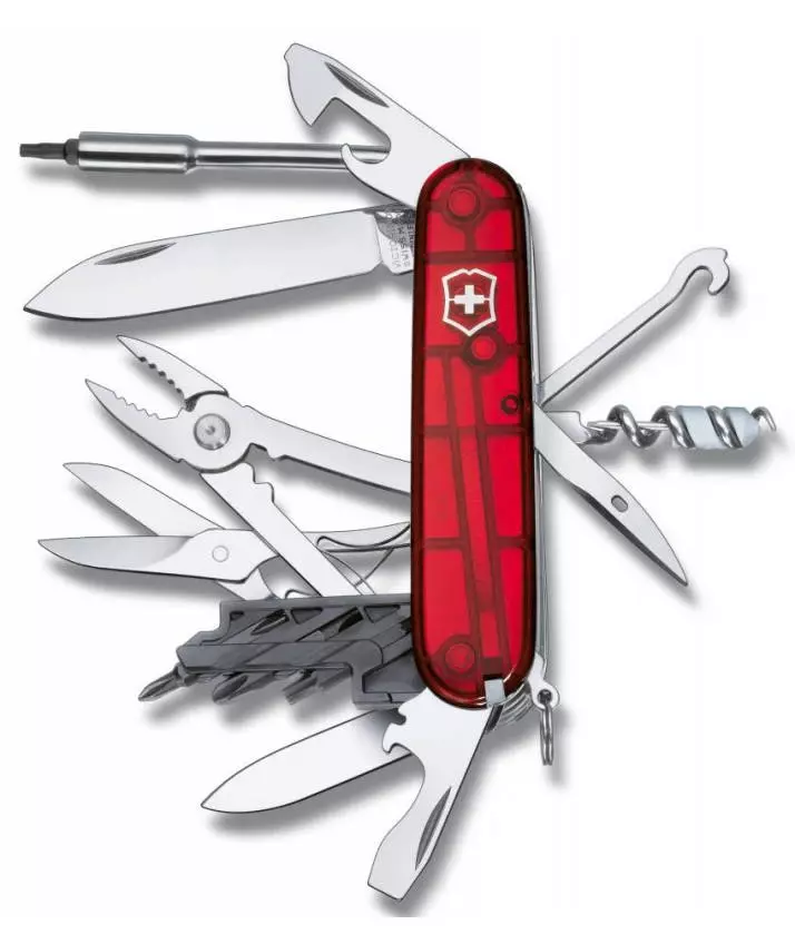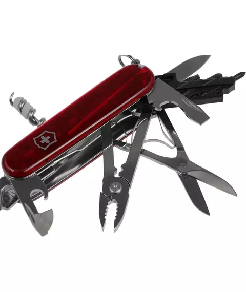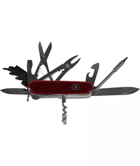 | Список функций | большое лезвие, малое лезвие, штопор, консервный нож с малой отверткой, открывалка для бутылок с отверткой - инструментом для снятия изоляции, шило, кернер, кольцо для ключей, пинцет, зубочистка, ушко для шитья, шариковая ручка, инструмент для переключения DIP-переключателей, |
