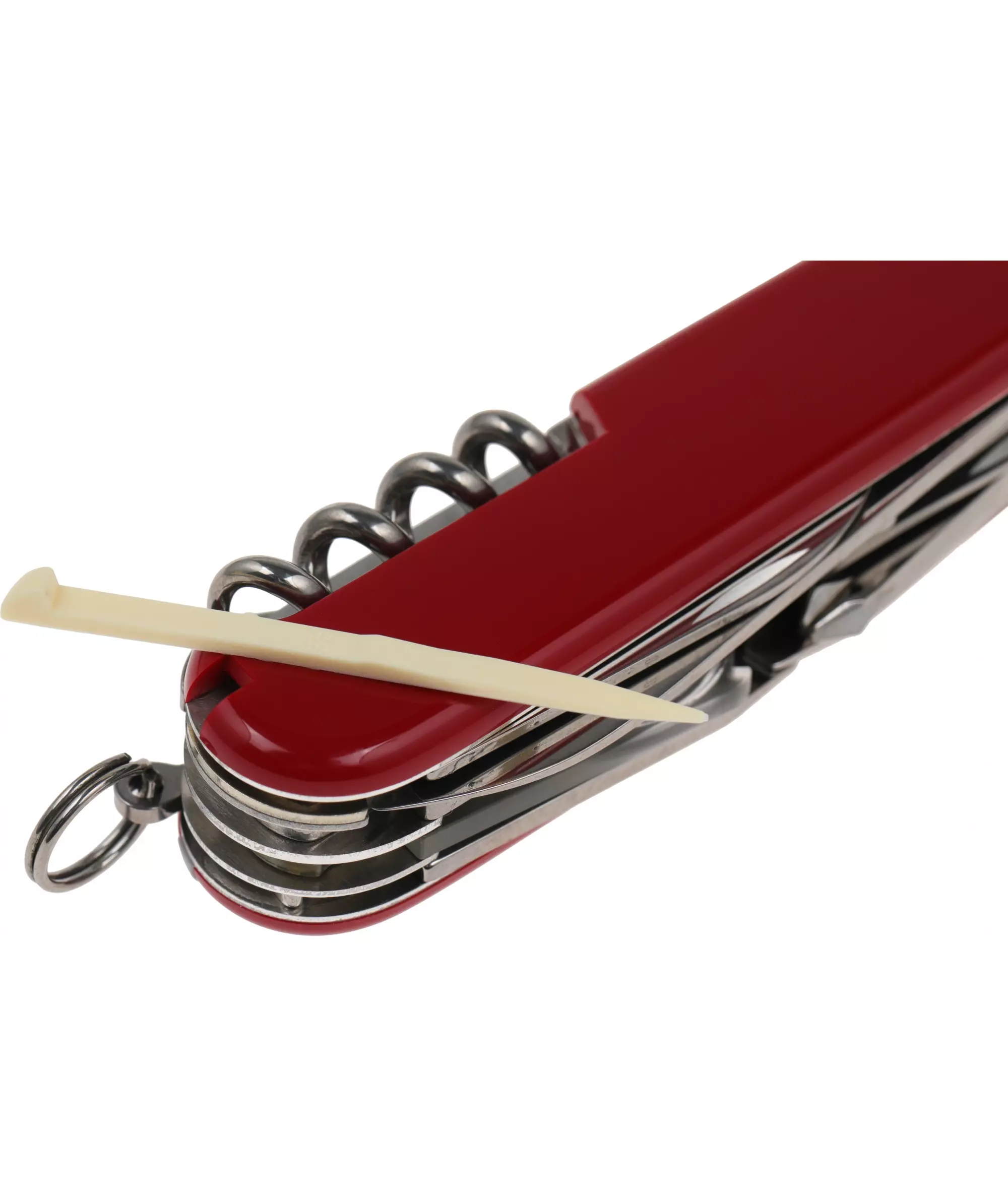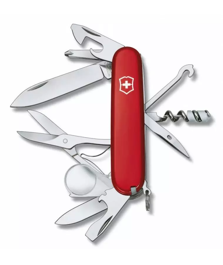 | Список функций | Нож, малый нож, консервный нож, открывалка, штопор, 3 отвертки, сниматель изоляции, шило(кернер), пинцет, кольцо для ключей, крючок, ножницы, лупа 8х, зубочистка. |
