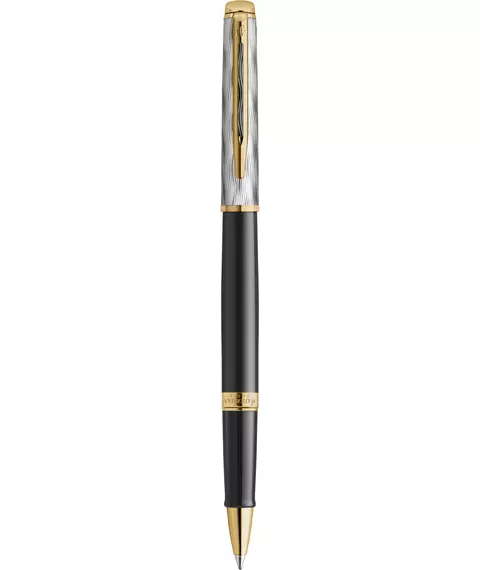 Waterman, ручка-роллер, металл и черный лак с золотой отделкой, точеный колпачок, тонкий наконечник.