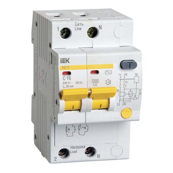 Выключатель IEK MAD10-2-016-C-030 автом. дифф. тока 16A тип C 4.5kA 30мА AC 2П 230В 3мод белый